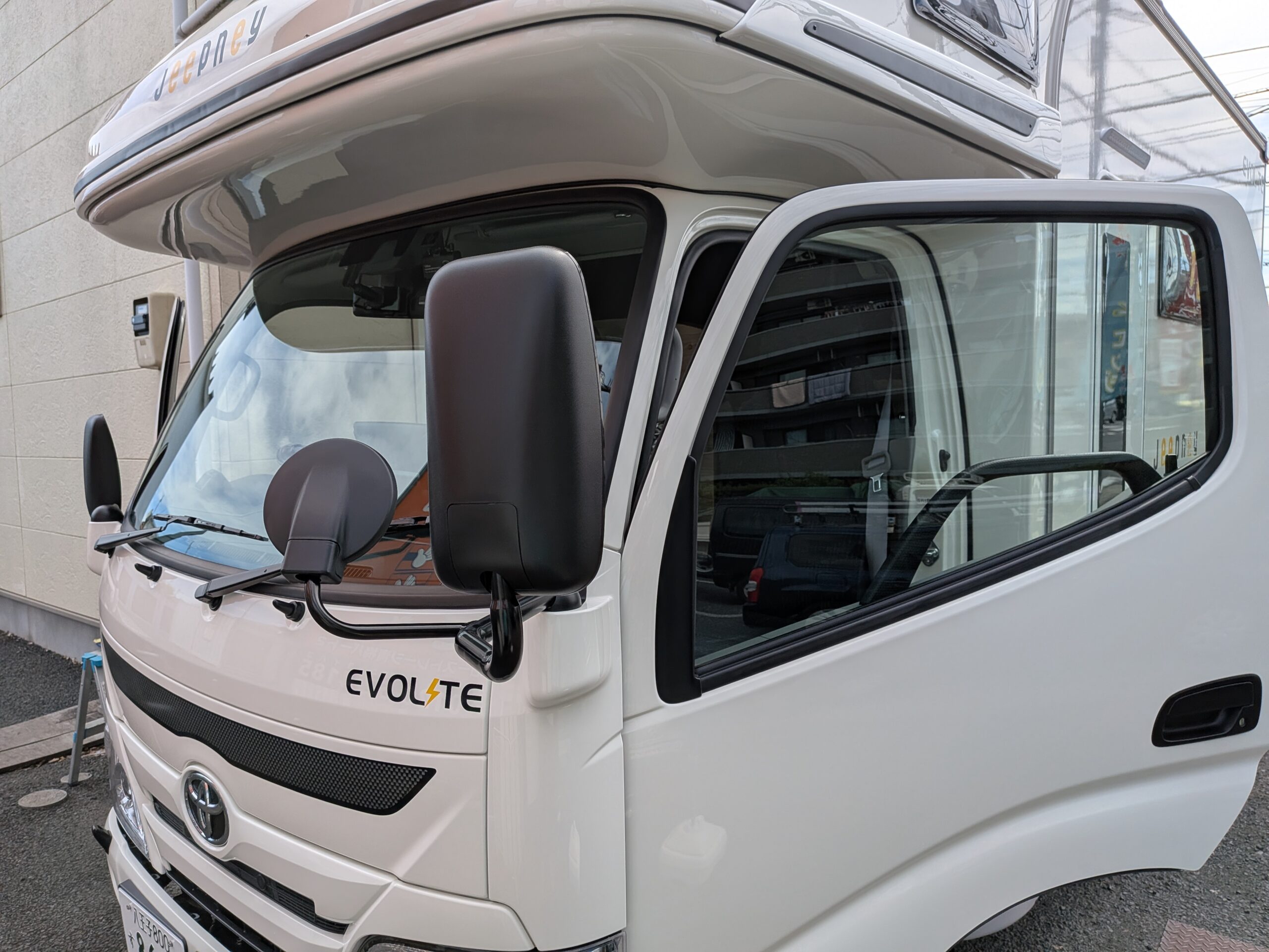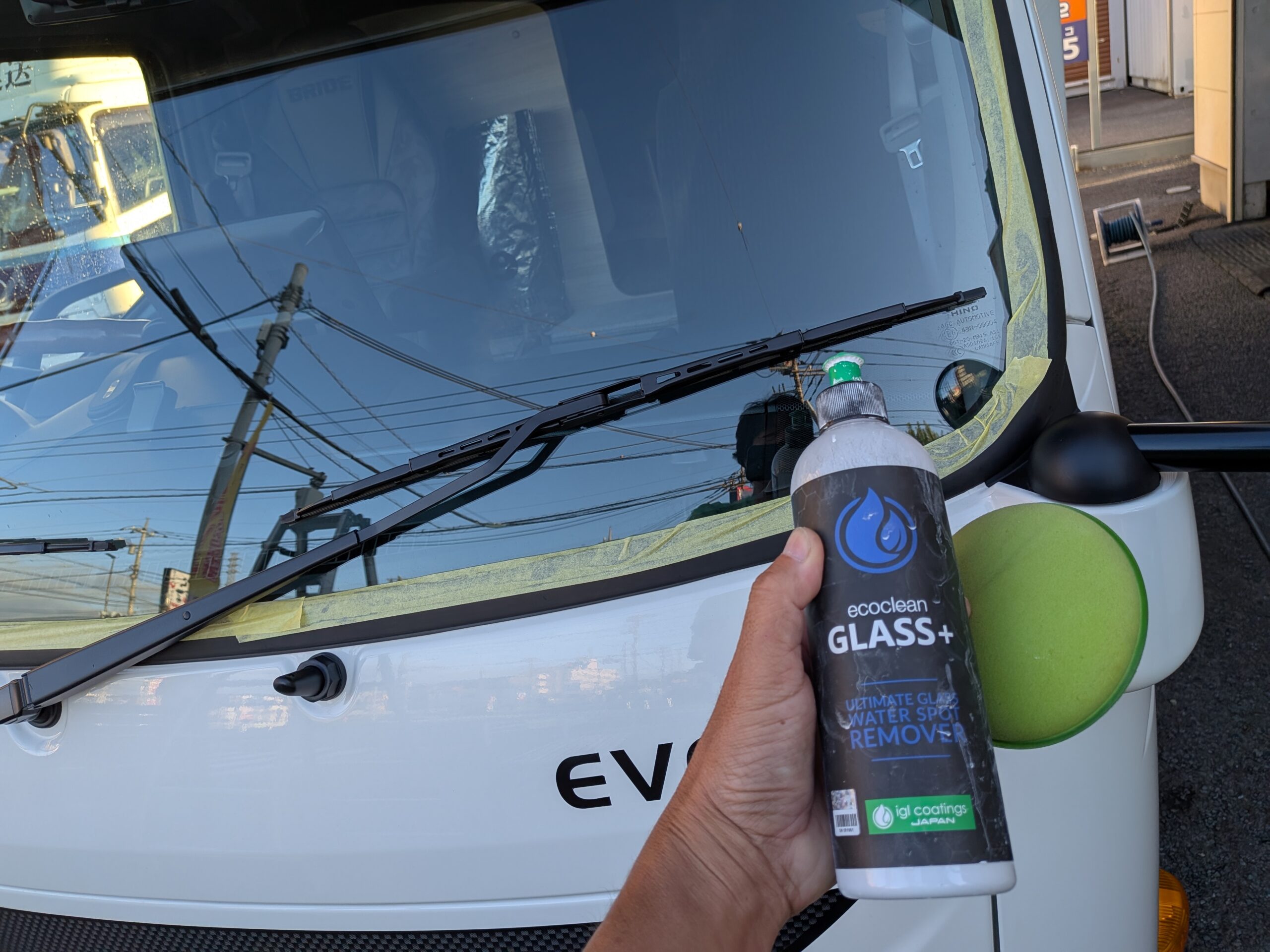 キャビン部分のウインドガラスもセラミックコーティングでお引き受けです。ドアミラー3つも施工いたしますからご安心ください。ウインドコーティングをやるのとやらないのでは今後の快適さが違います。絶対おすすめです!
