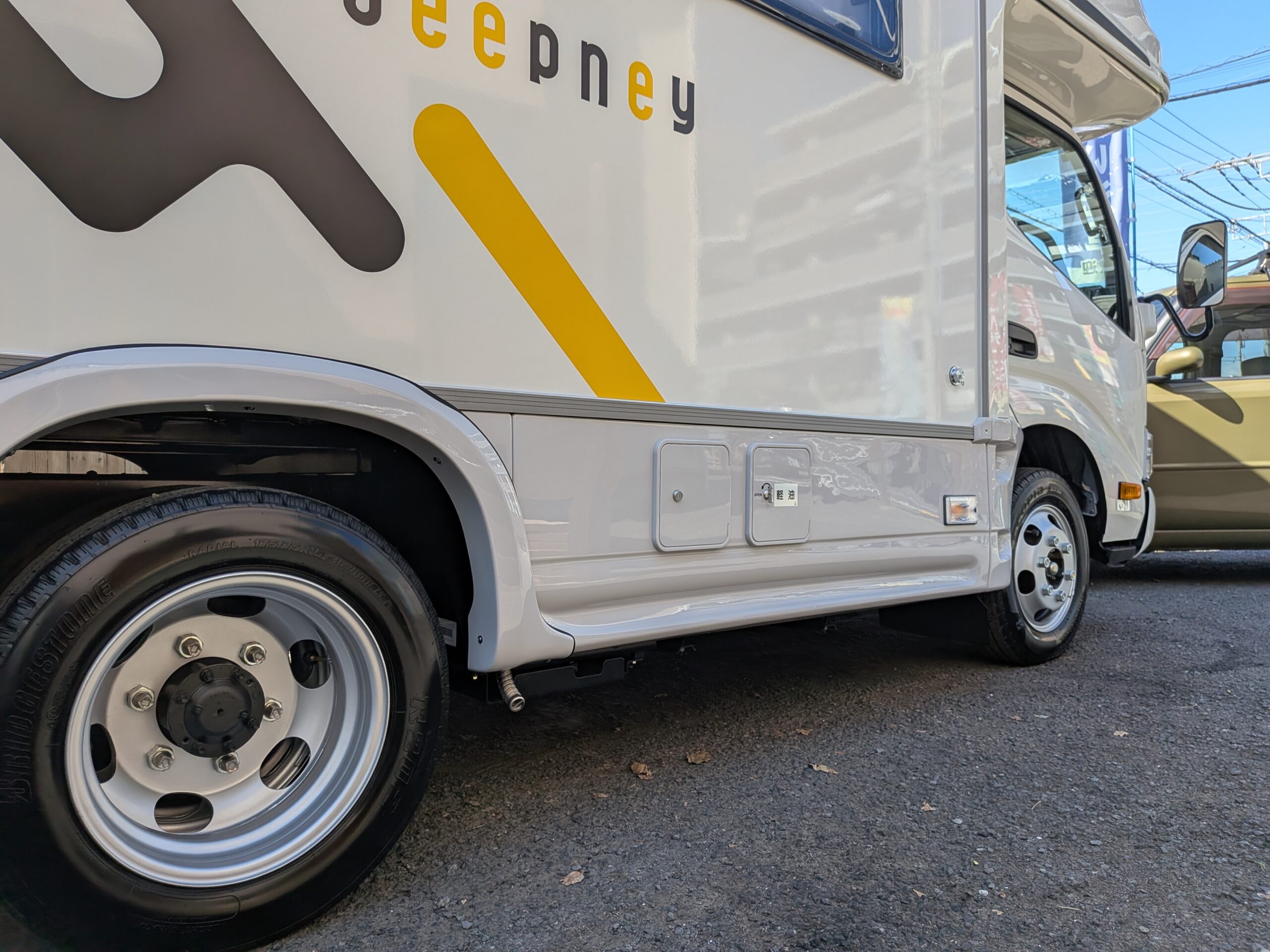 新車特有ですが、色々架装するのでシーリング剤の飛び散りが各所あります。のちの磨き工程で処理いたします。新しいうちは目立たないのが、だんだん黒ずんで見えてきます