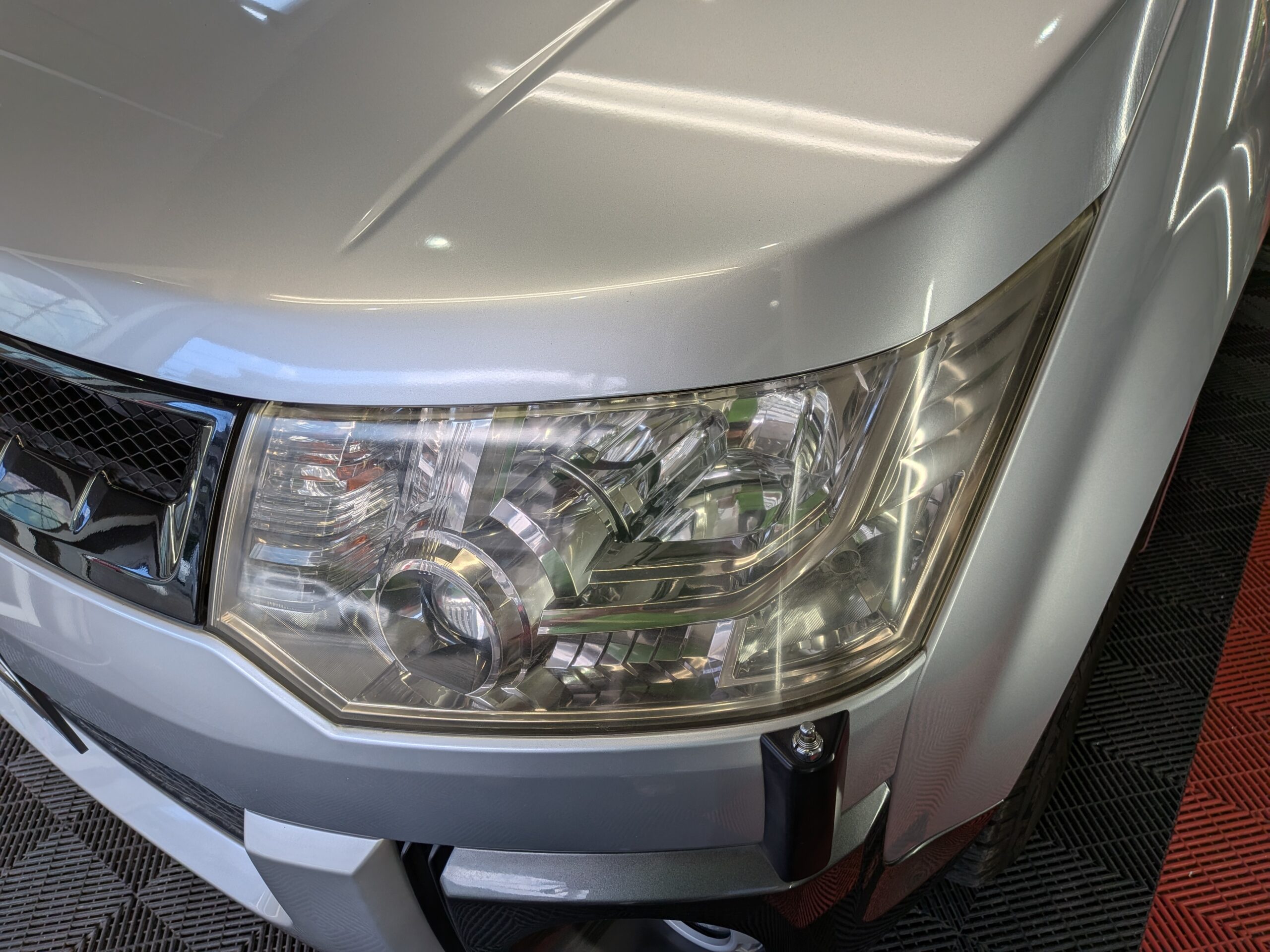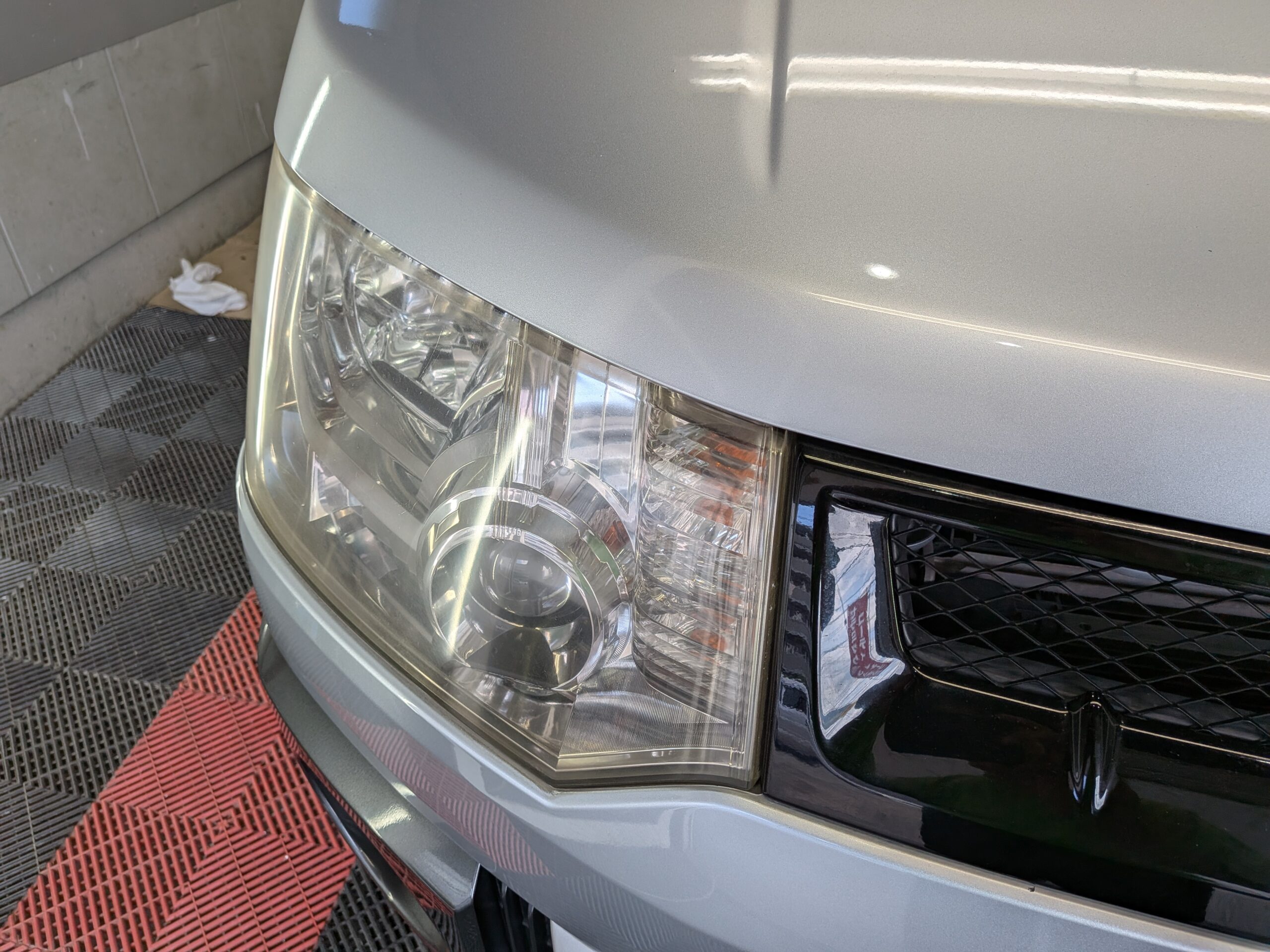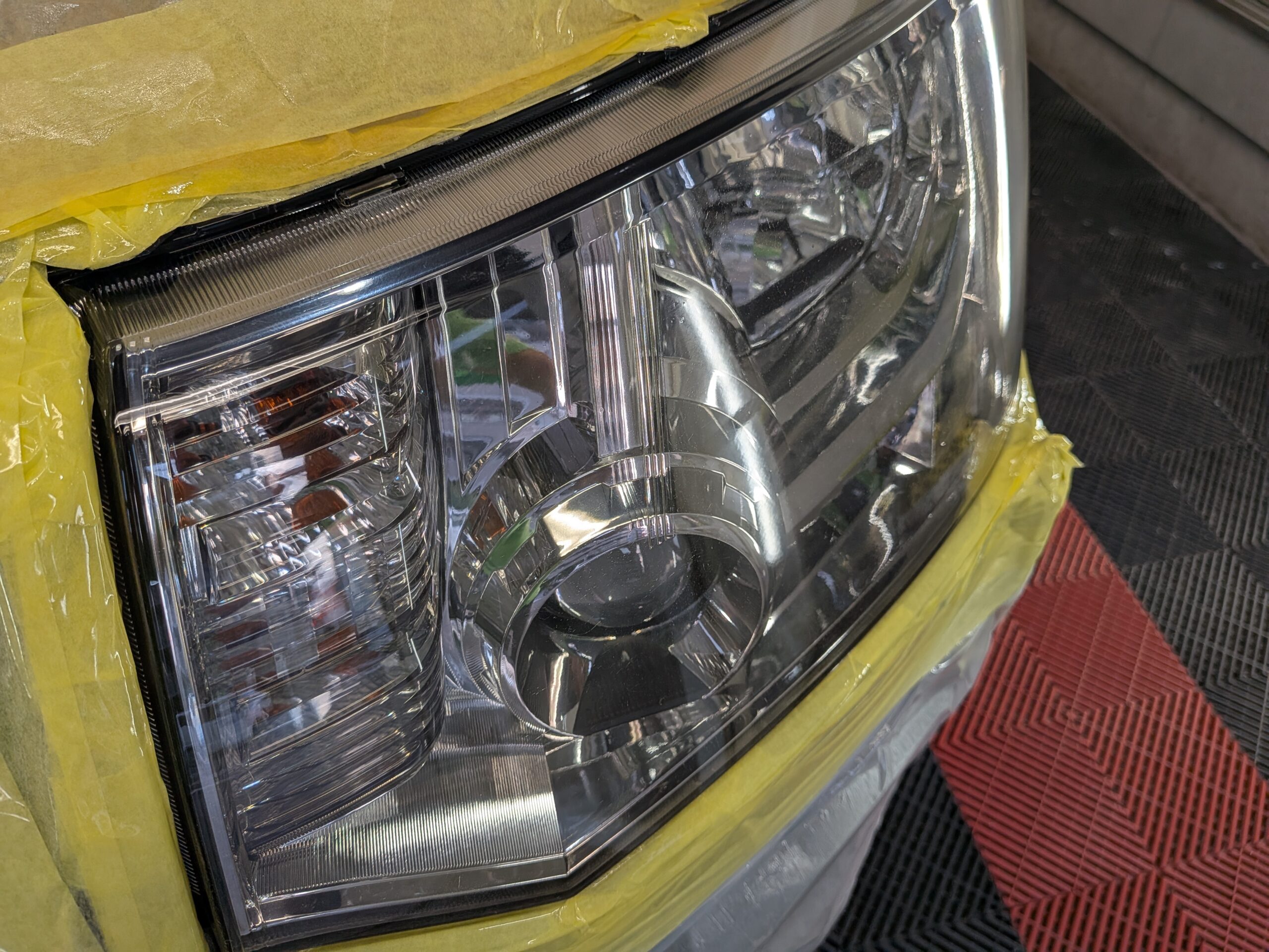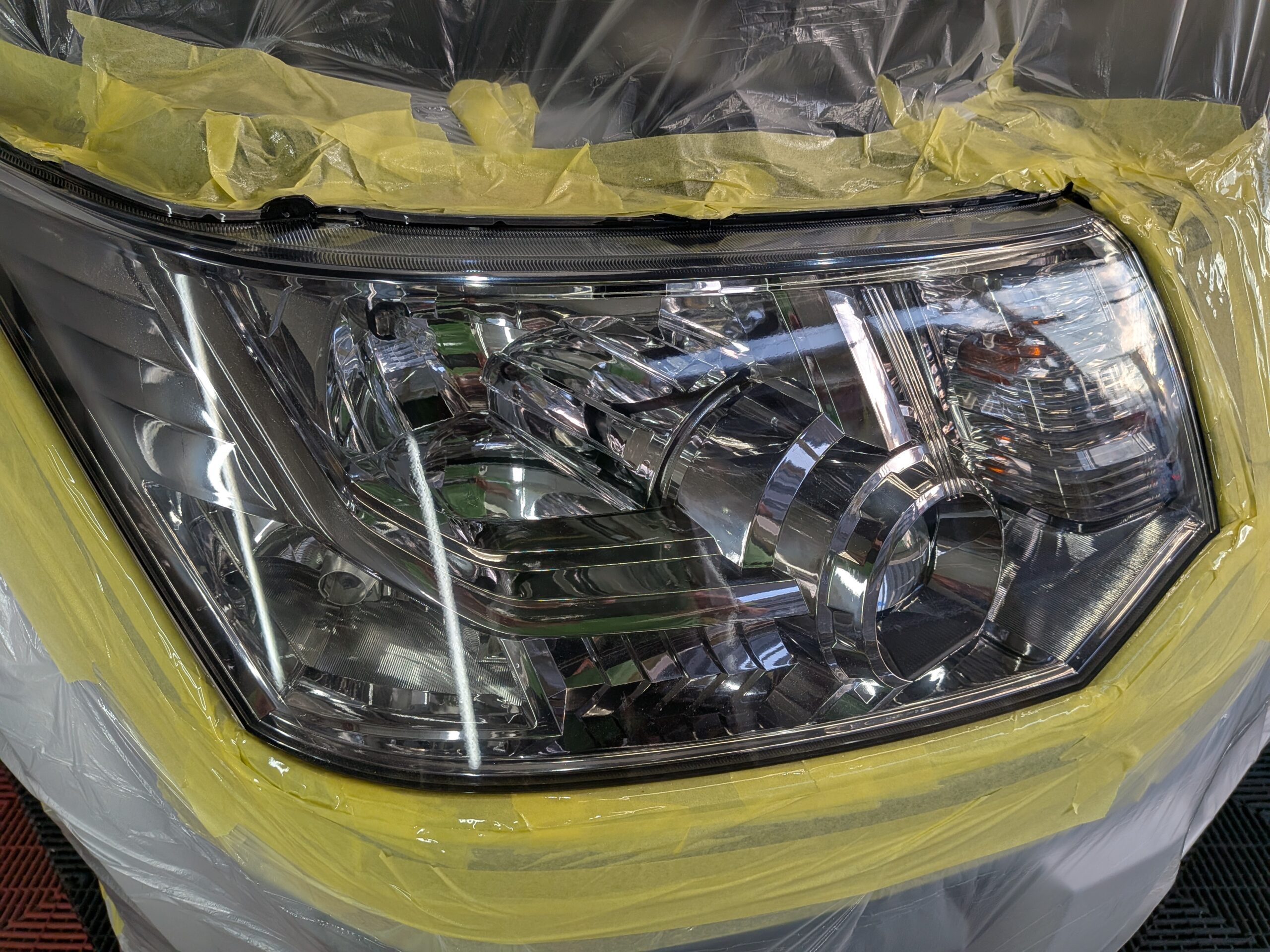 クラック(キズ、き裂)は深く削り過ぎると、クラックそのもの自体の拡散、ポリカ自体の”張り”の減少で今後のライト光線のゆがみ、車検項目の光軸の不安定のリスクなどがでてきますので、今回施工は、黄ばみとムラ感はなくして段差もなくして、厚い保護層を施しまして今後の外からの劣化を極力ないようにさせていただきます