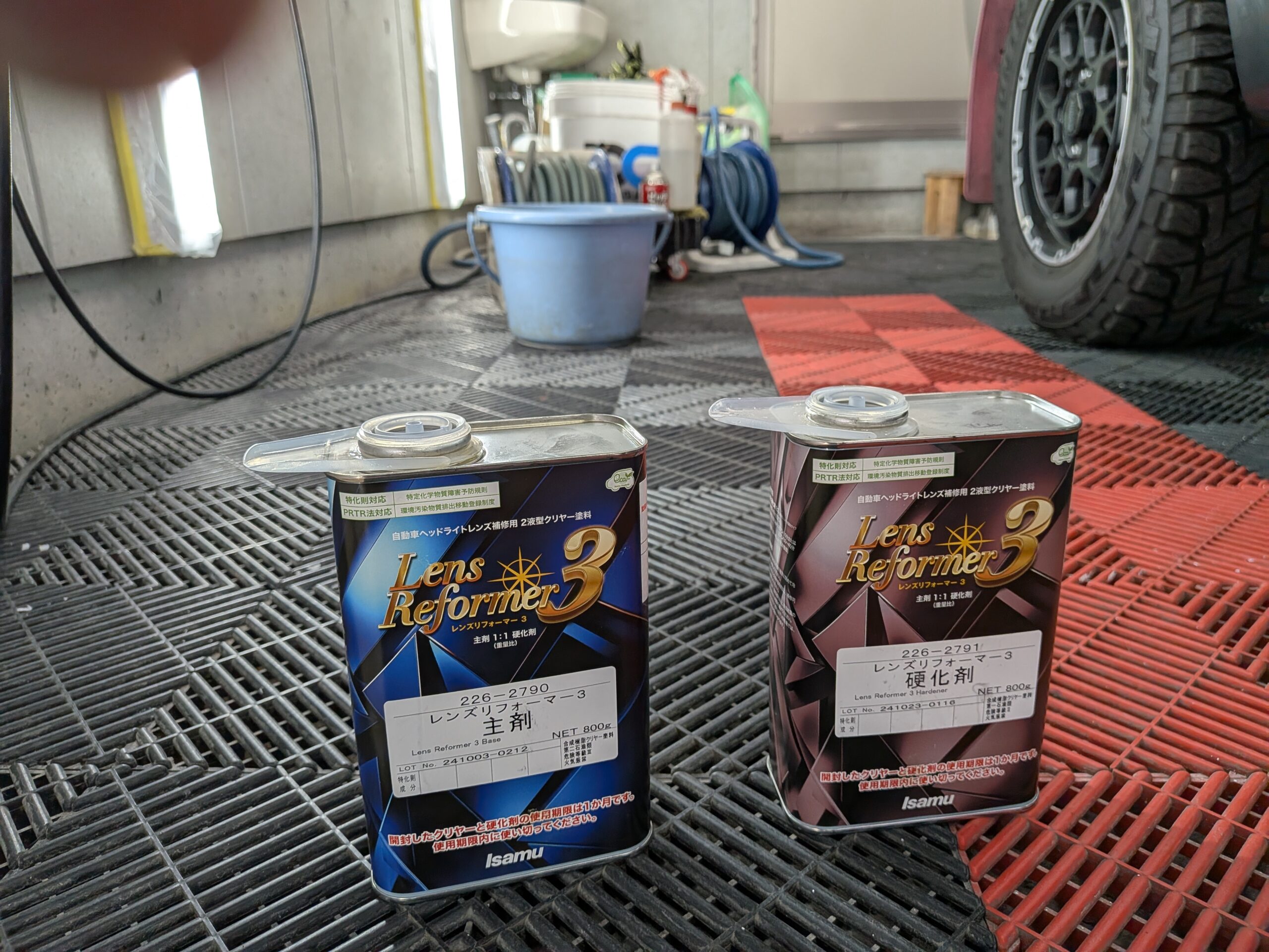 施工するクリアーはこちら。本液と硬化剤の比率が通常のボディ用とはかなり違います。ガチガチ系のクリアーです。それだけライトレンズは弱いのです