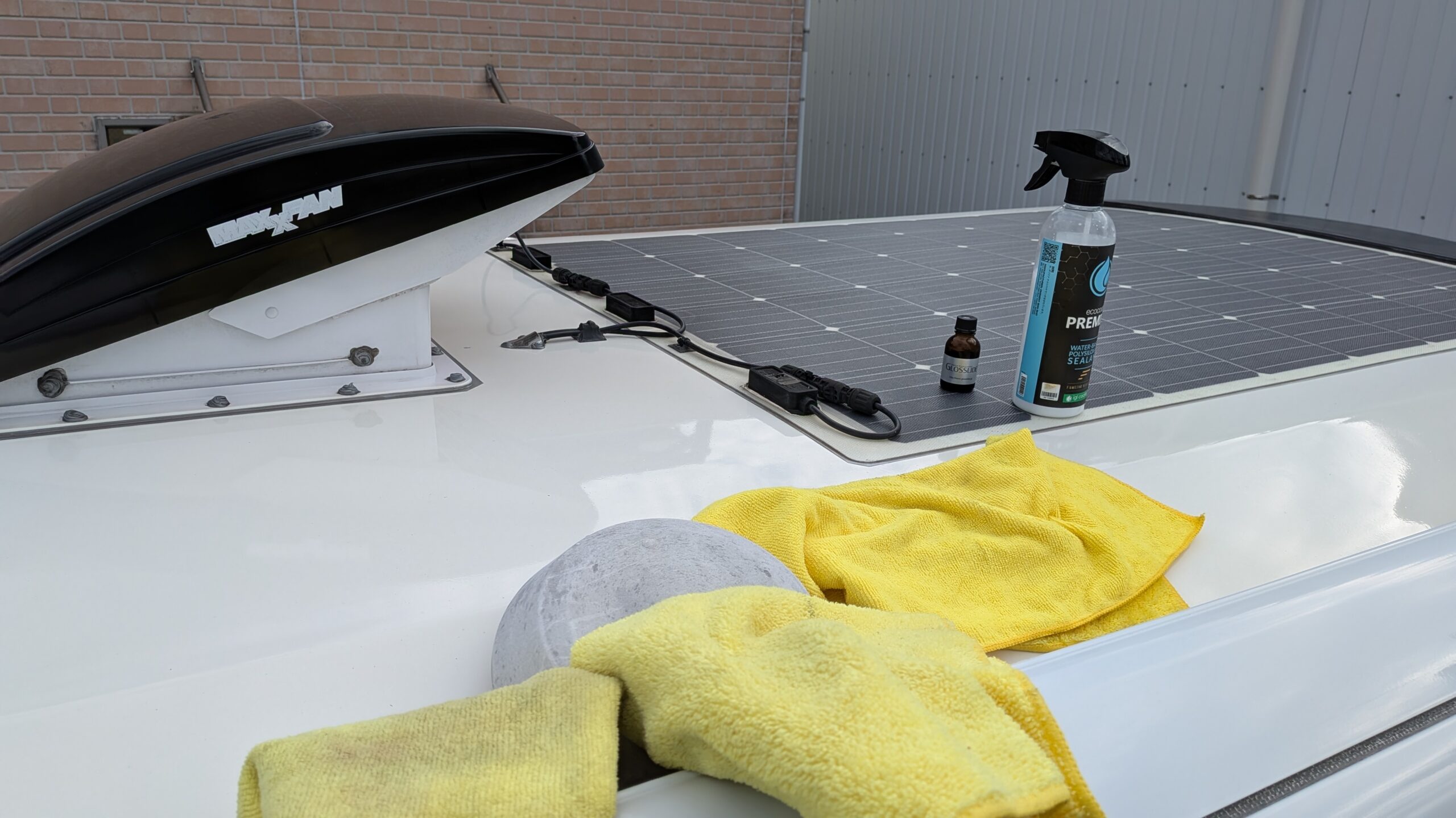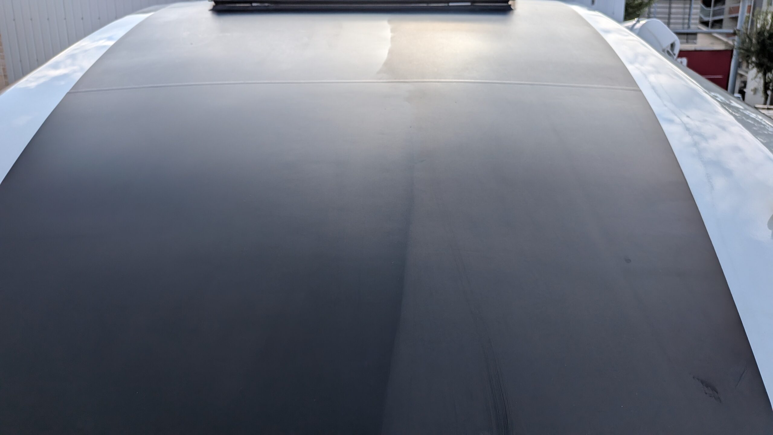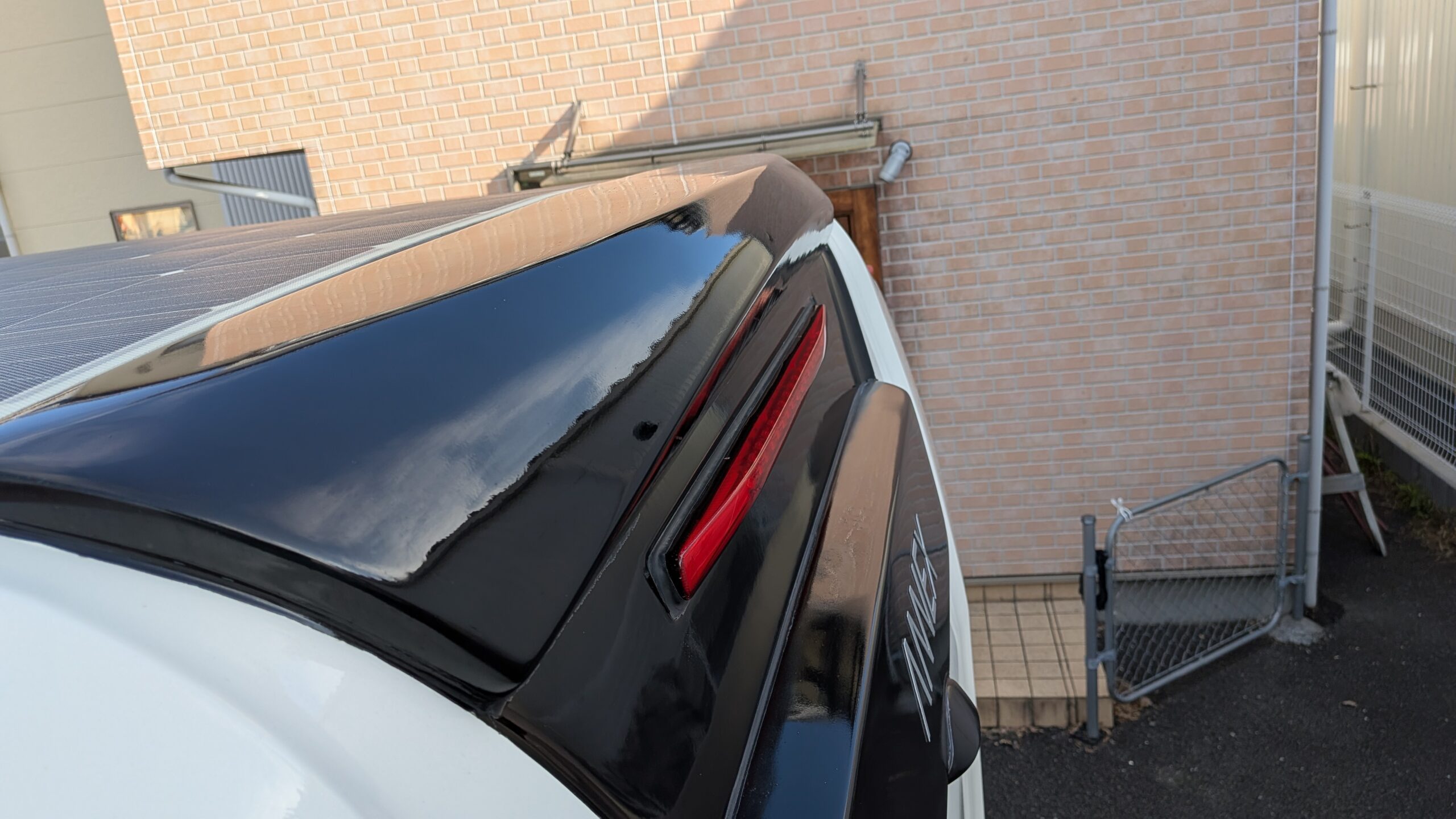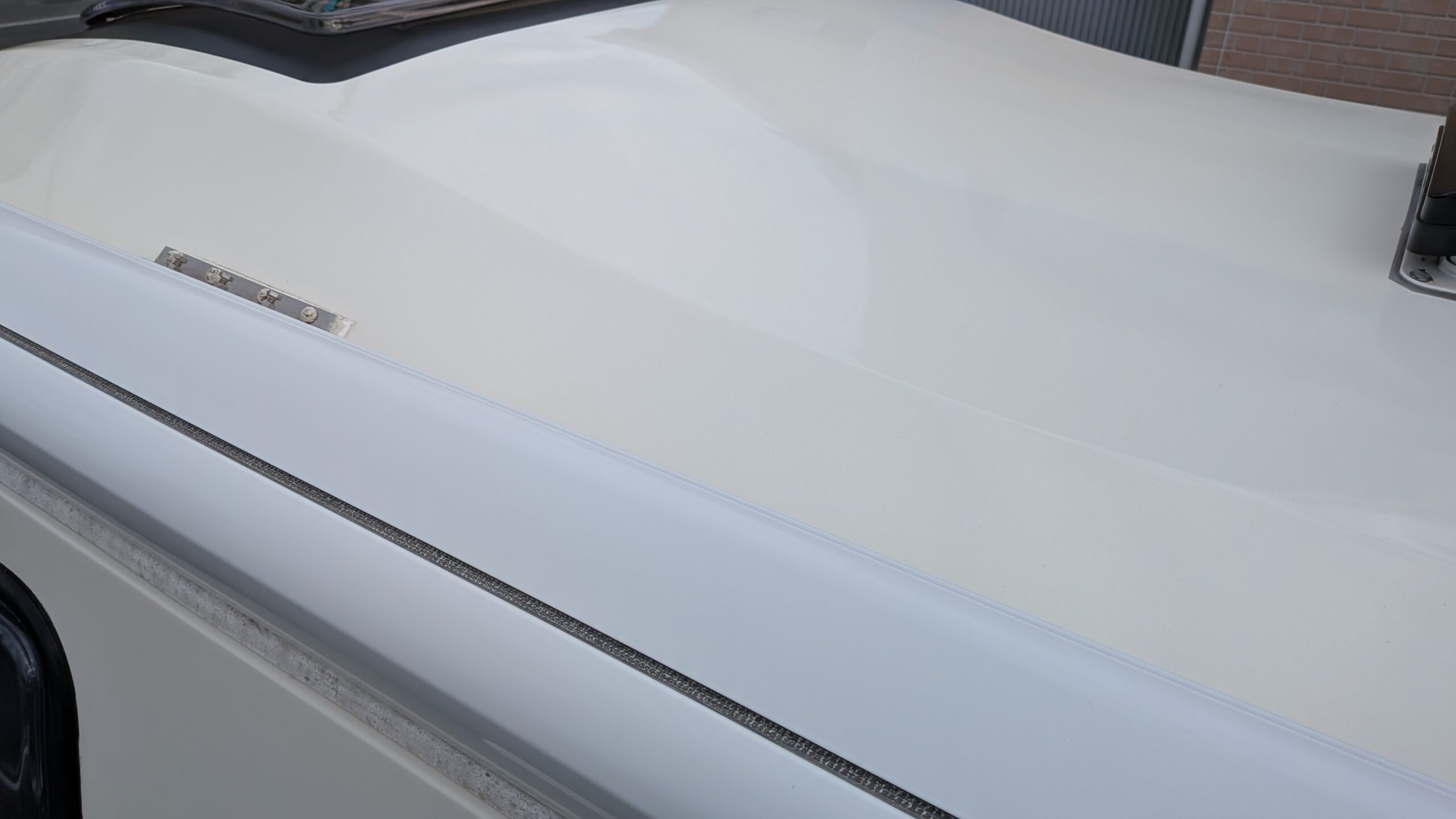 ルーフまわり〜前・左右上部、リヤ面を紫外線劣化FRP再生クリアー+ガラスコーティング