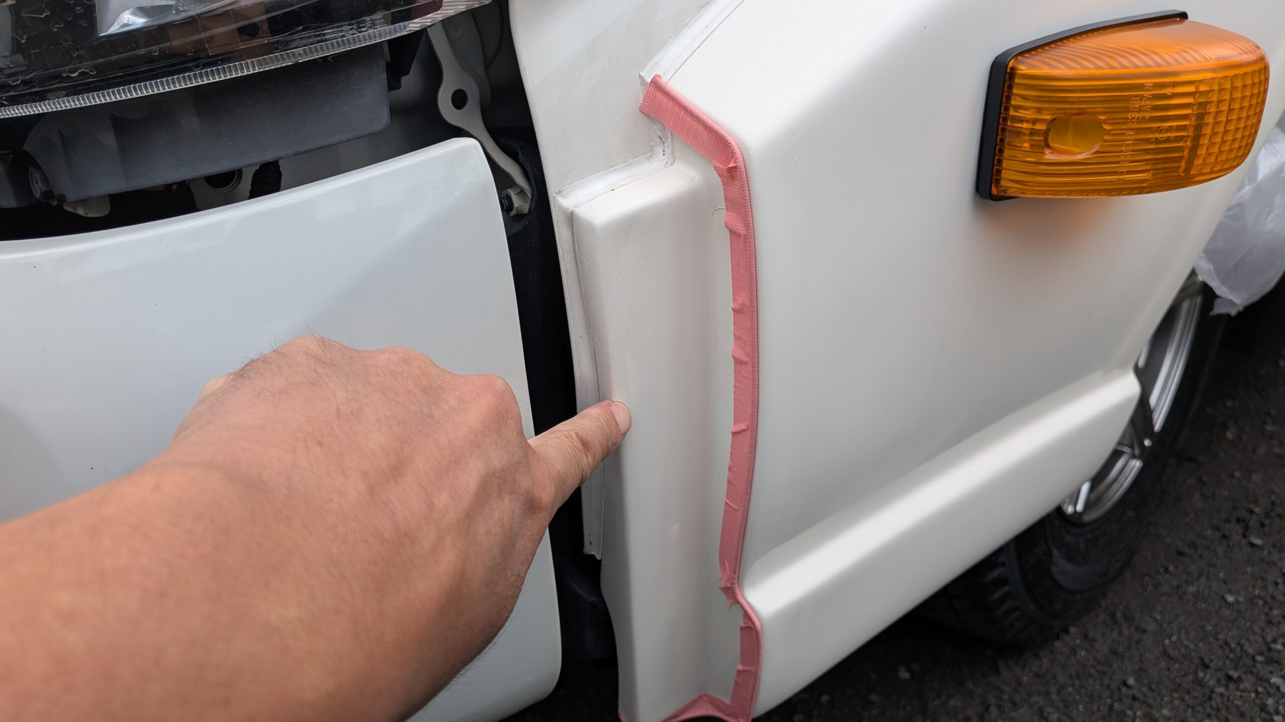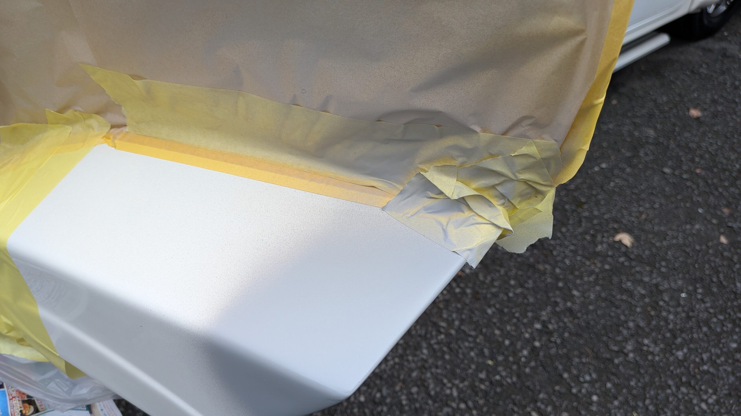 指さししている区画は表面の塗装の割れらしきものが上下にありますので塗装トラブル回避でマスキングとしています