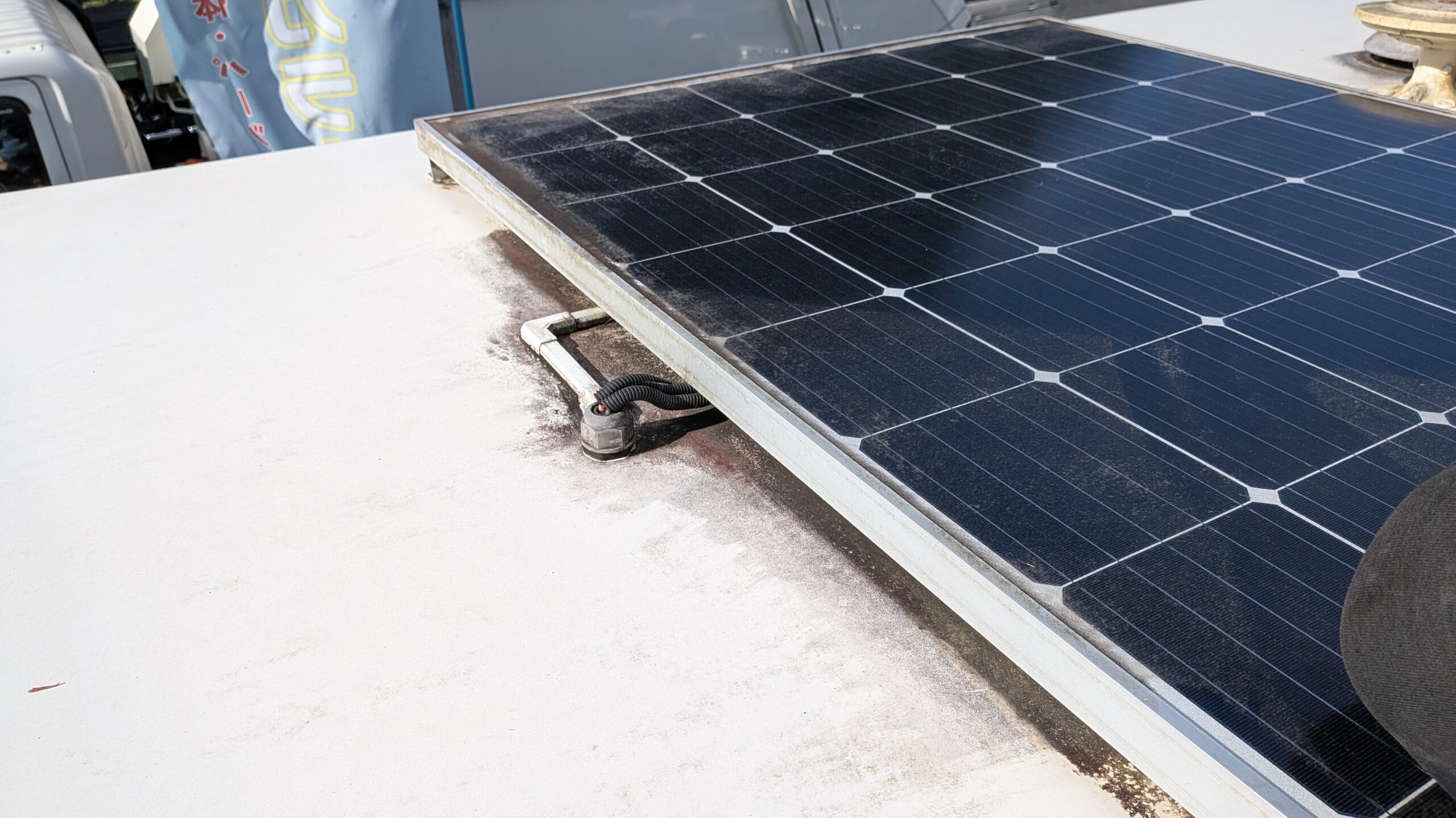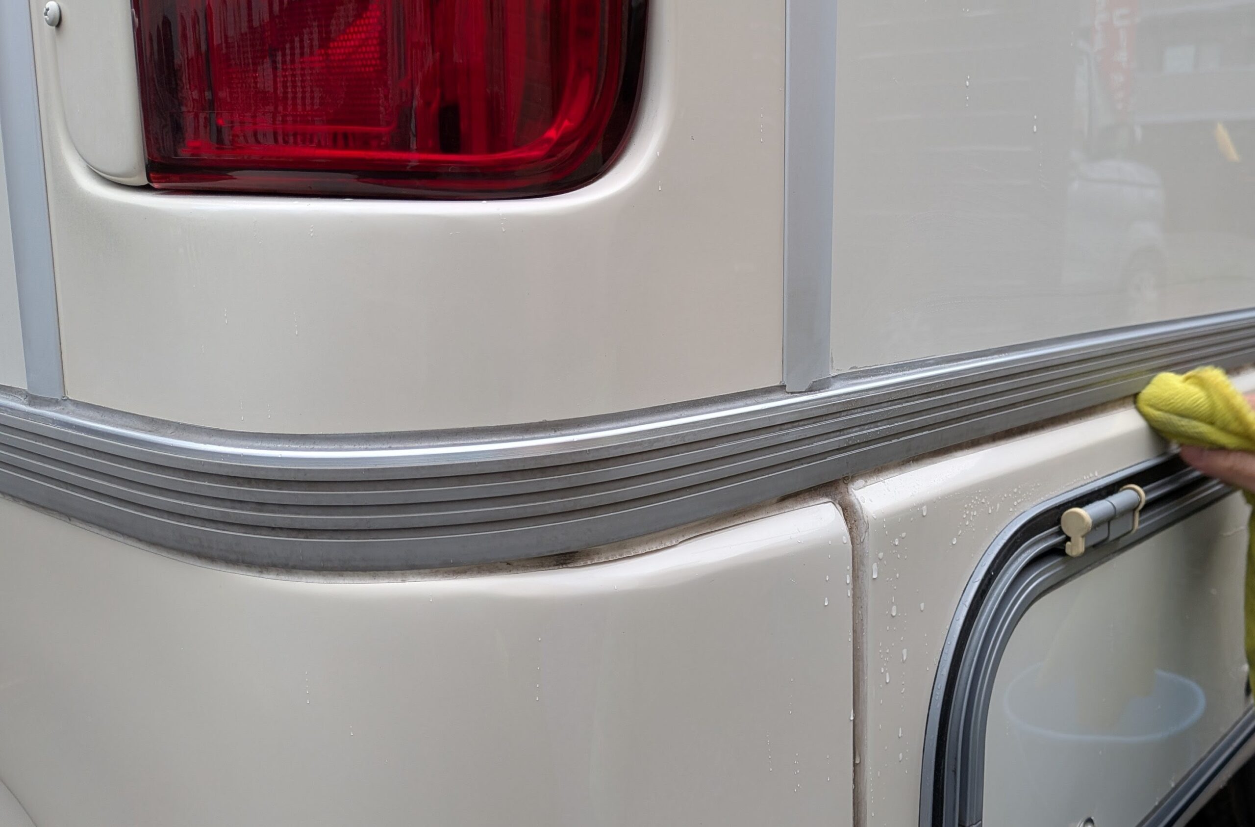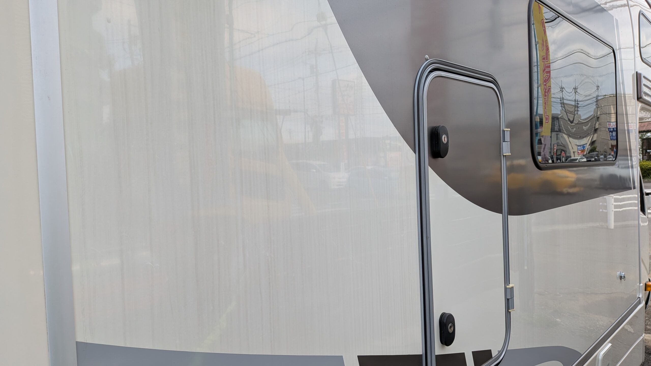 FRP、キャビン塗装面はイメージ通りキレイになってきますが、写真のモールやコーキングは落ちない黒ずみもけっこうあります