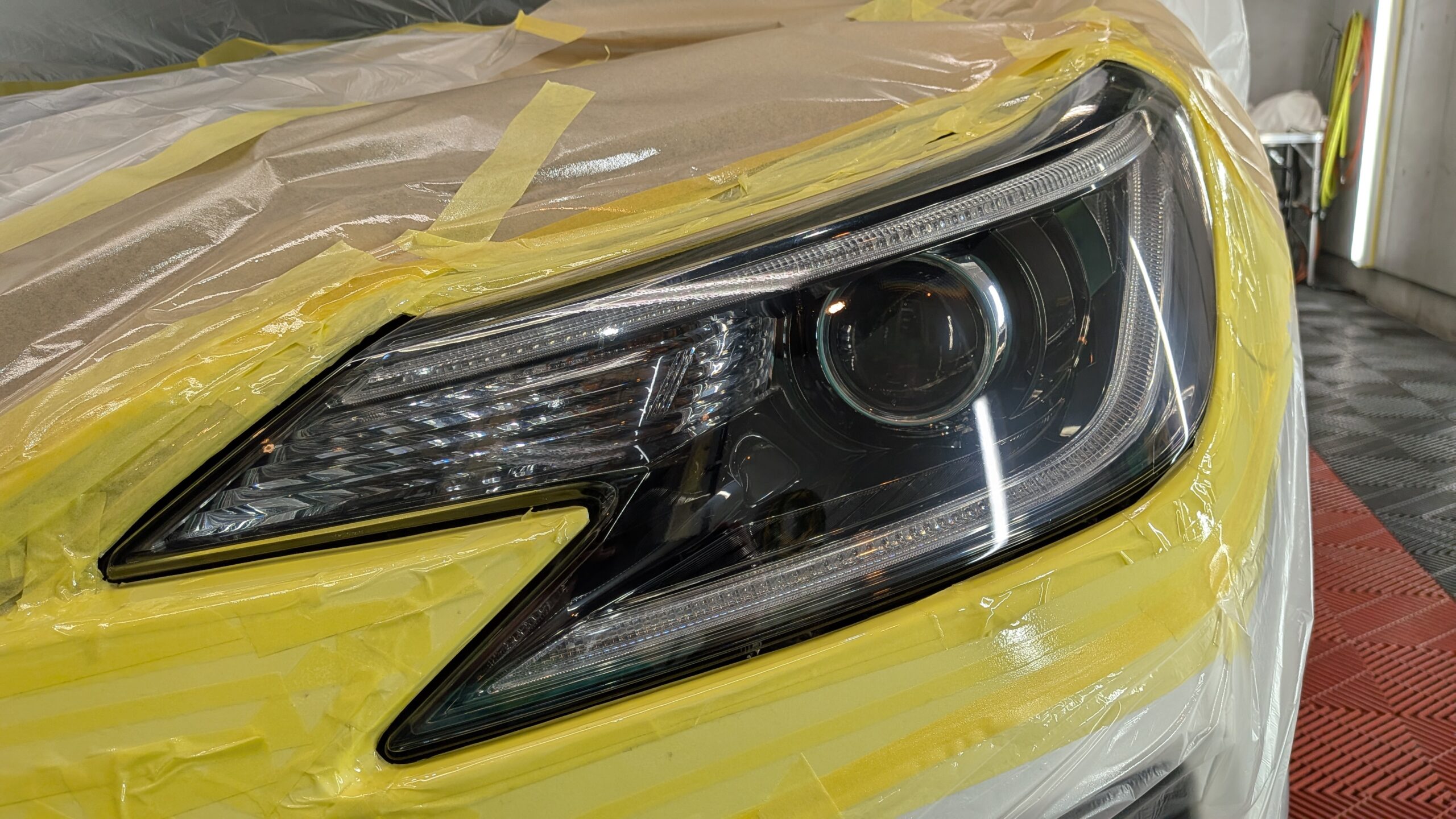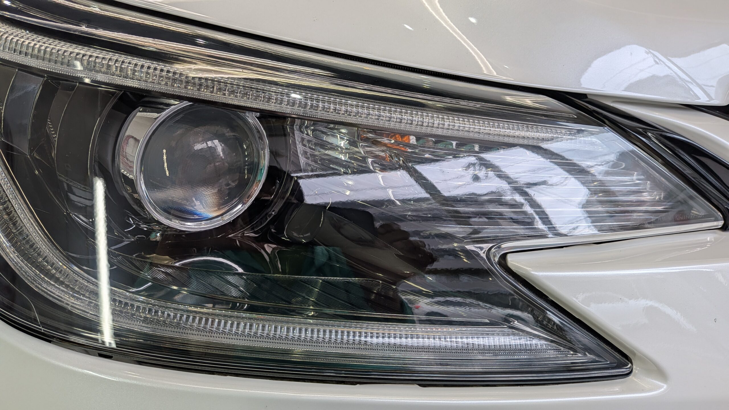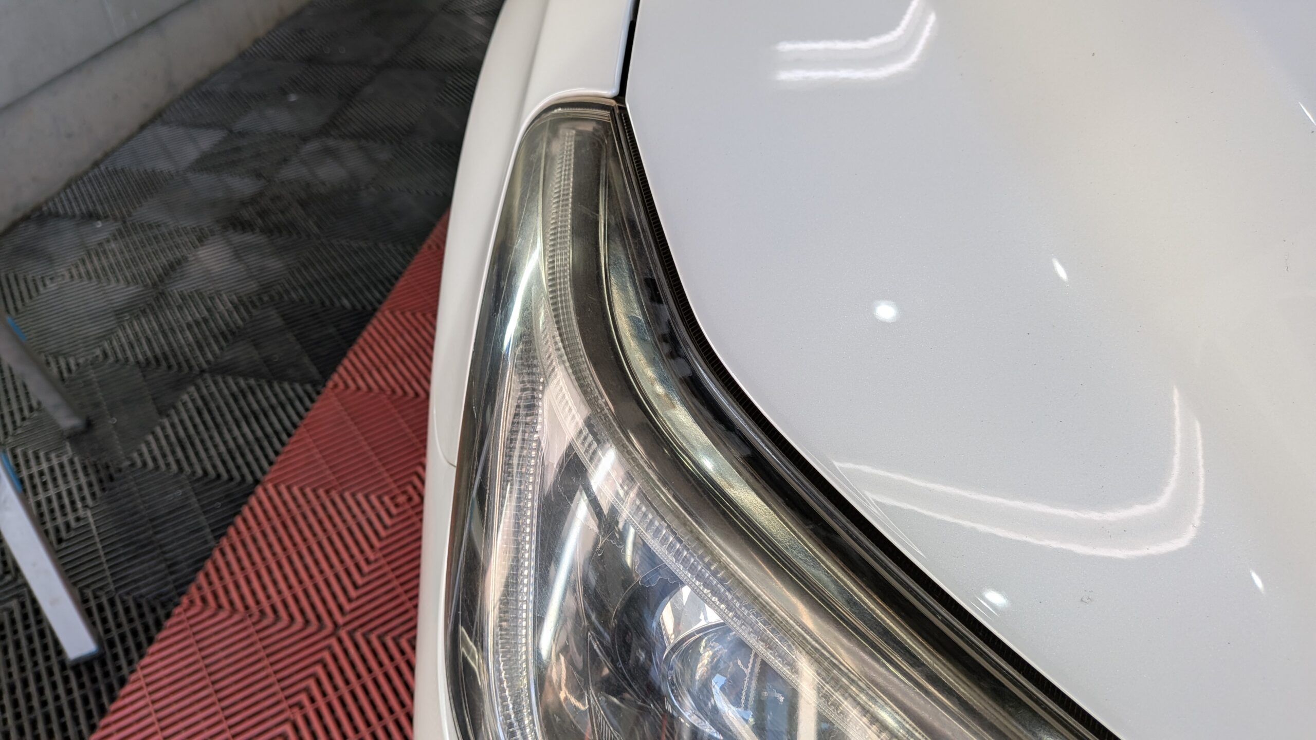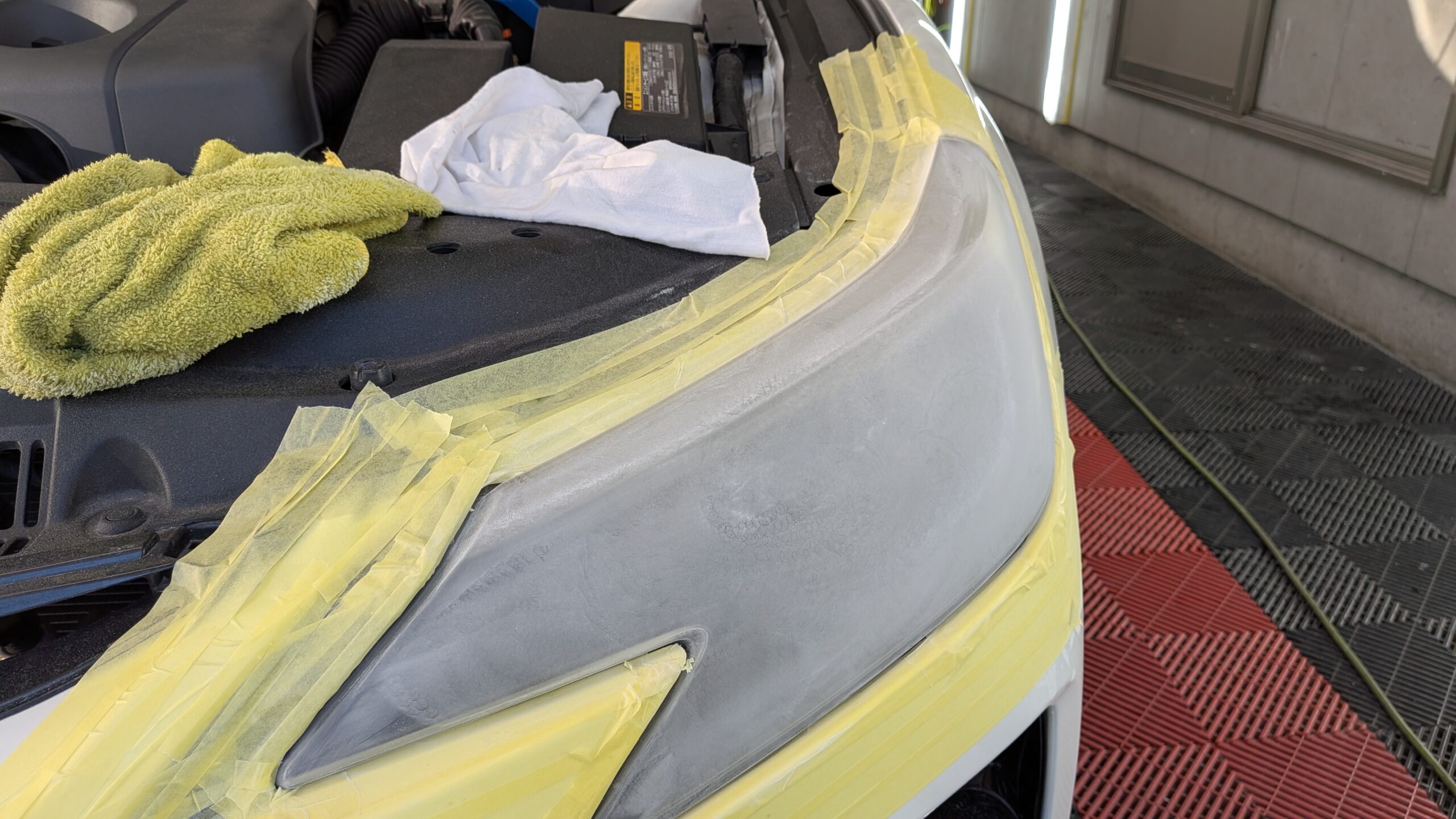 ご入庫日はヘッドライト黄ばみ、表面クリアーのき裂のリペアから始めさせていただきました