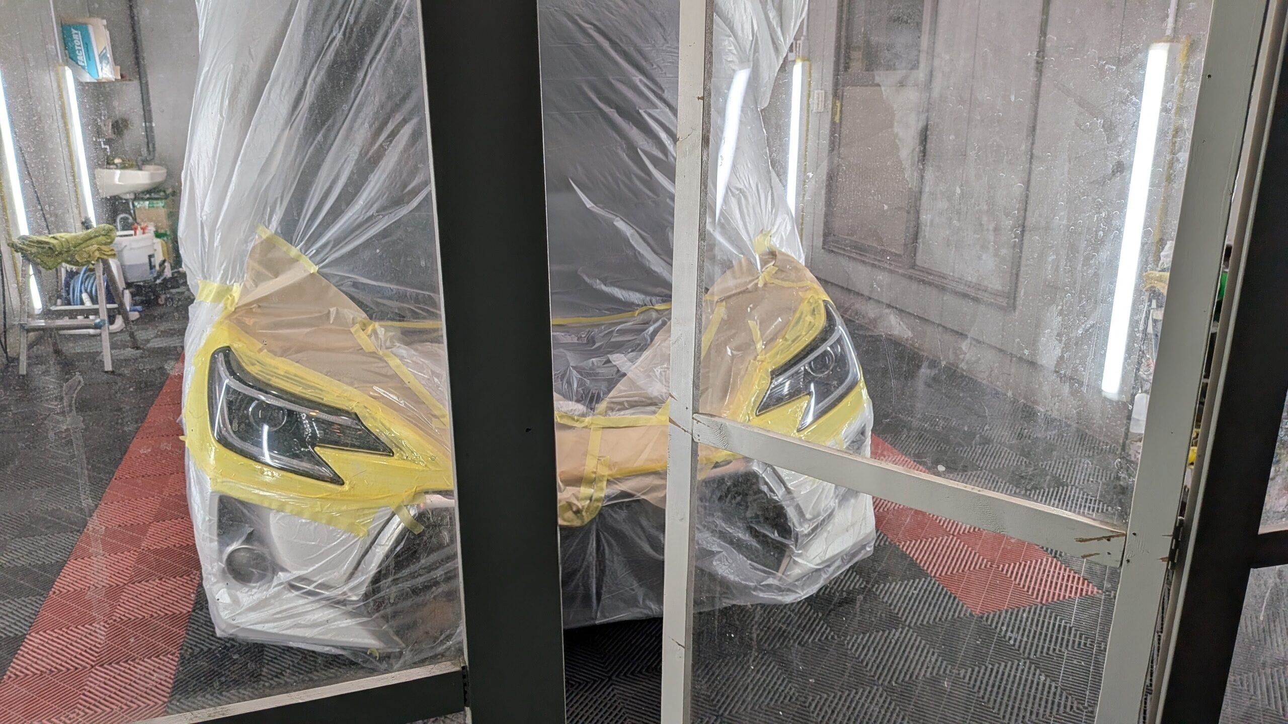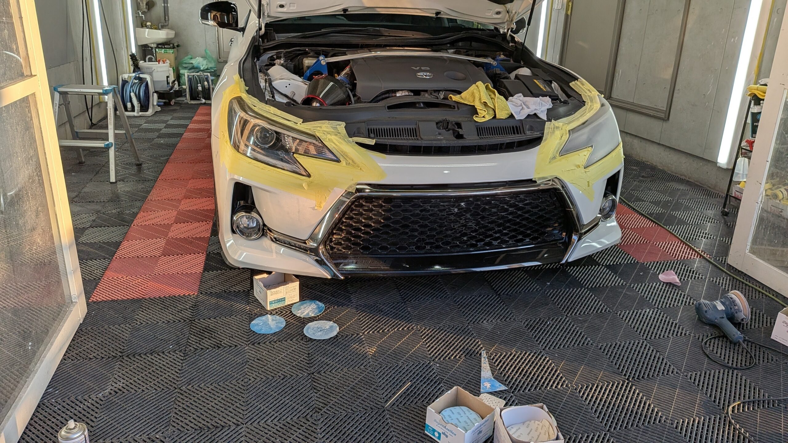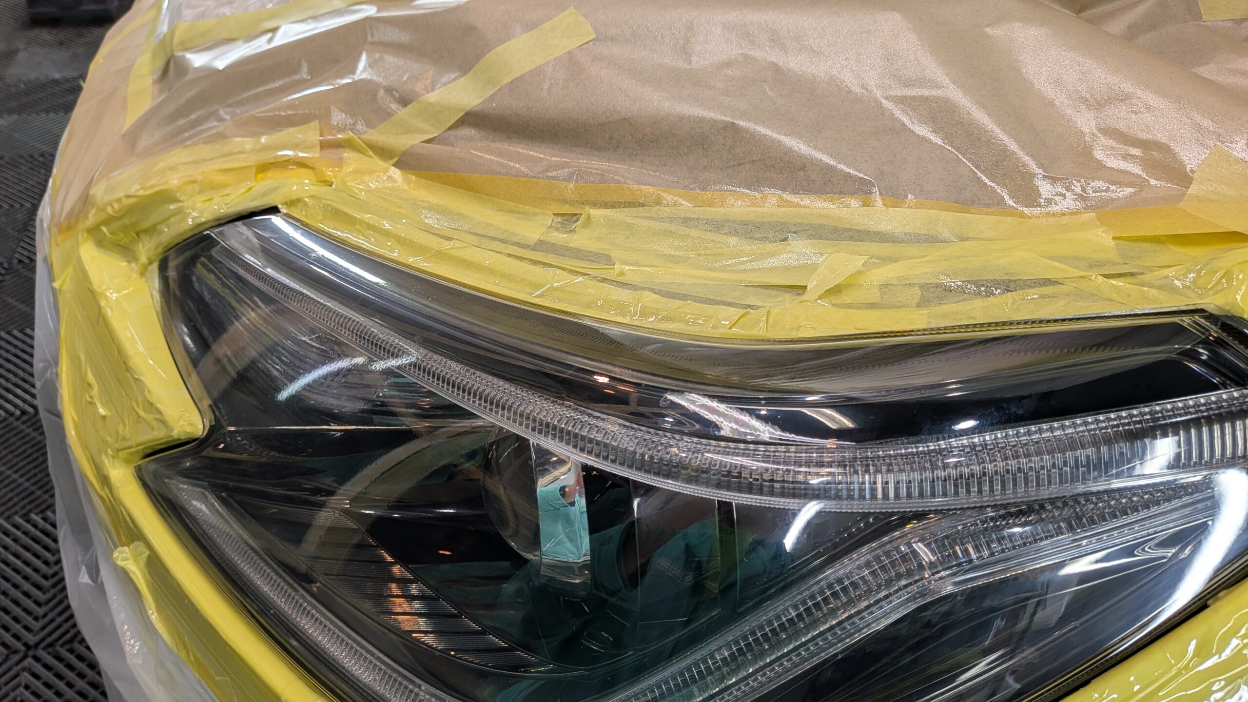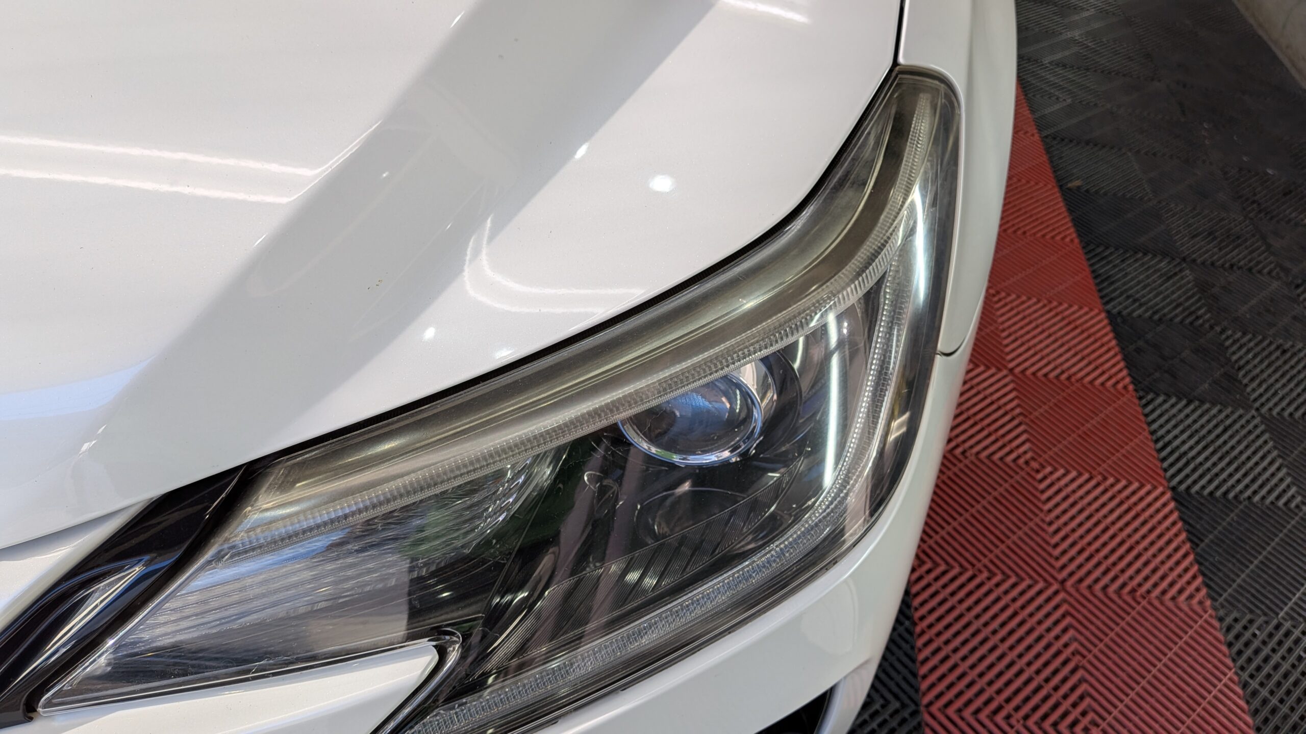 ご入庫日はヘッドライト黄ばみ、表面クリアーのき裂のリペアから始めさせていただきました