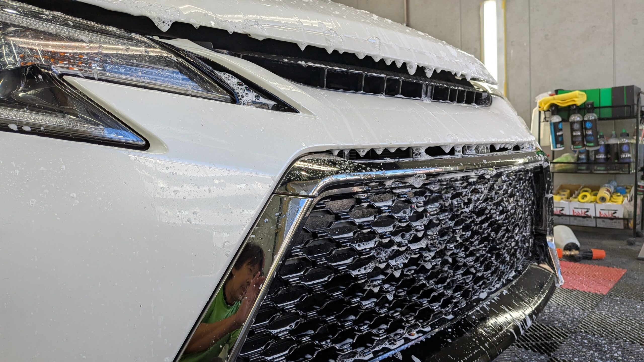 昨日施工のヘッドライト面の塗料も1晩置いて乾いていますので洗車からです