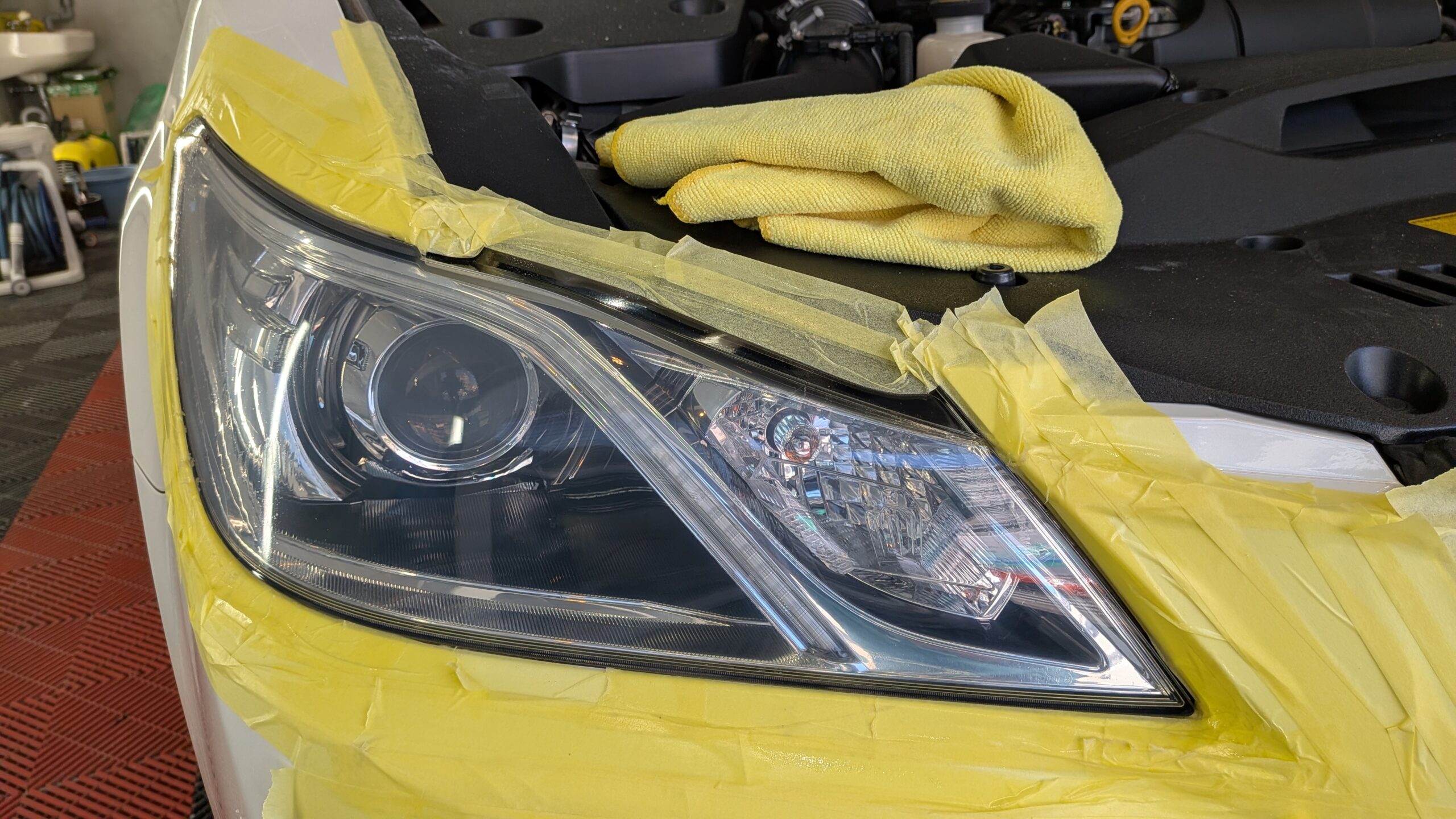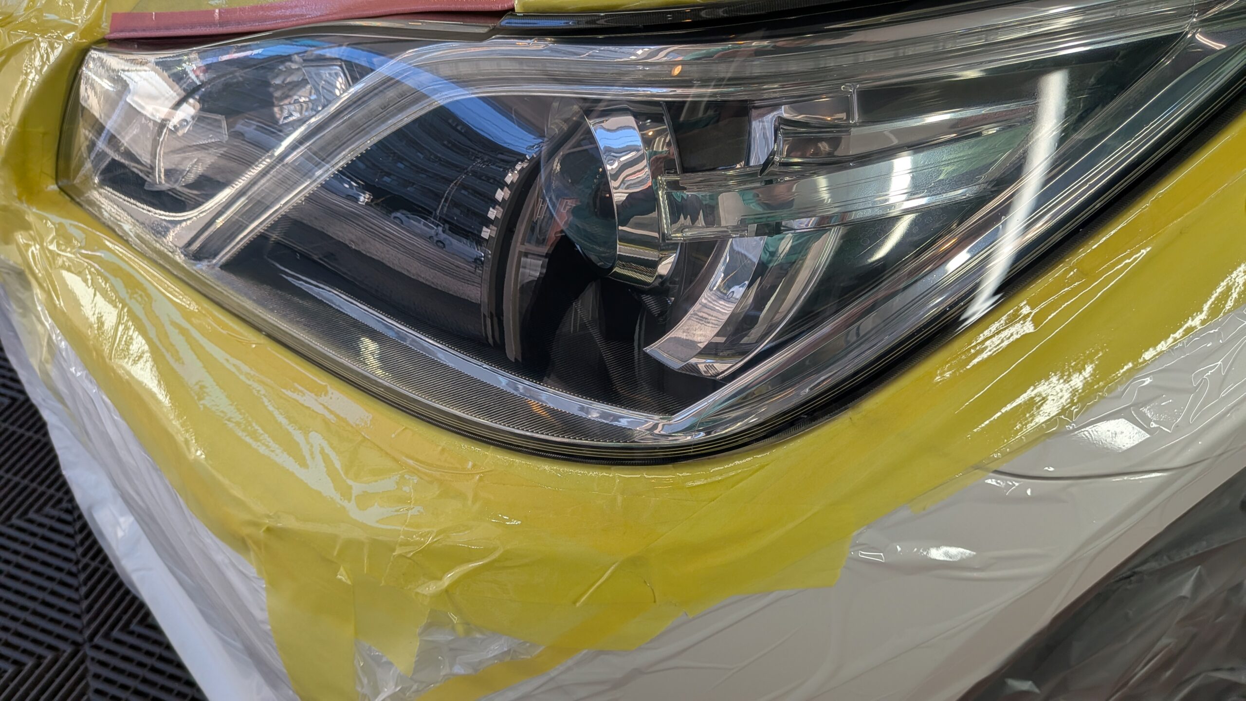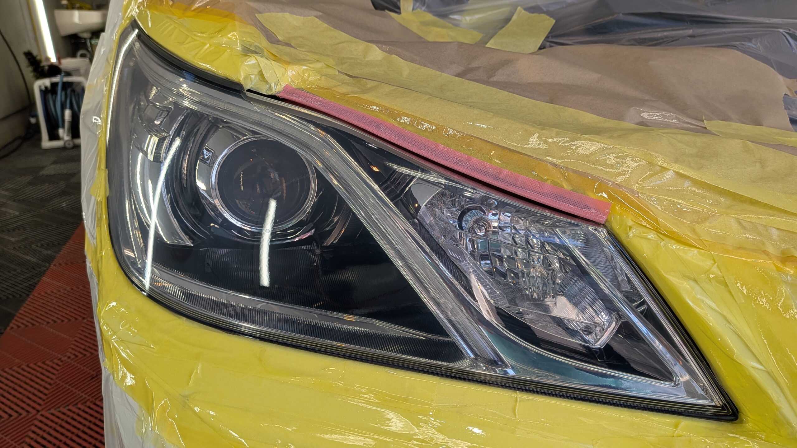 サンディングして、試しクリアーでチェックして、キズやご依頼のレンズ黄ばみやレンズ表面の割れ、段差などを確認しているところ