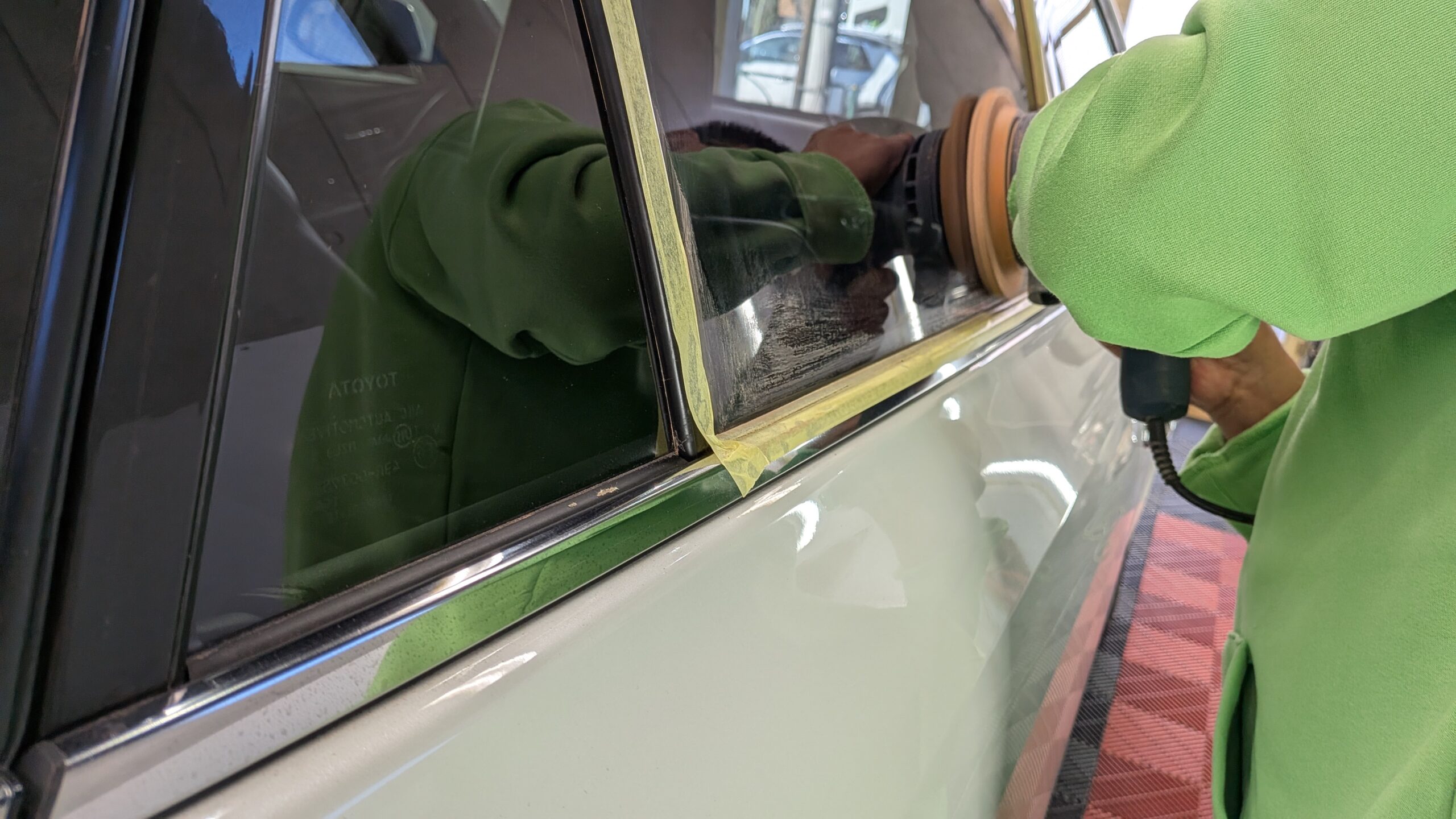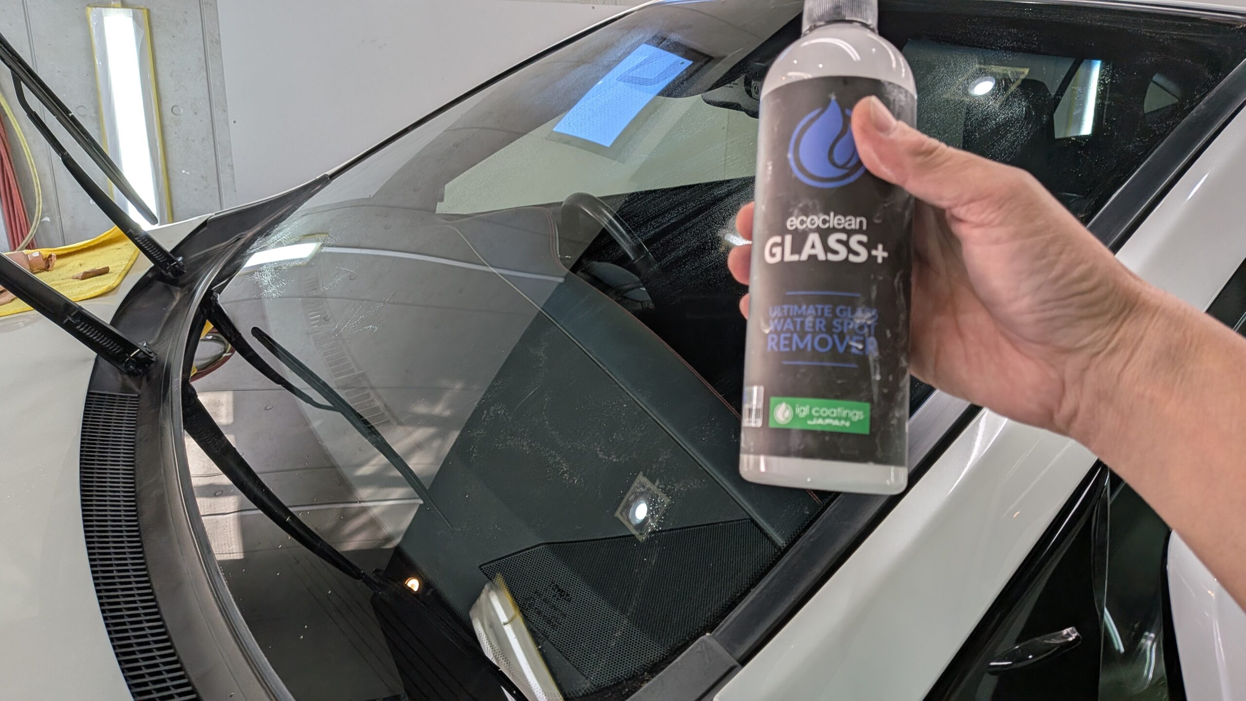 iglコーティングス「ガラスプラス」やガラス用コンパウンドで磨き進めます