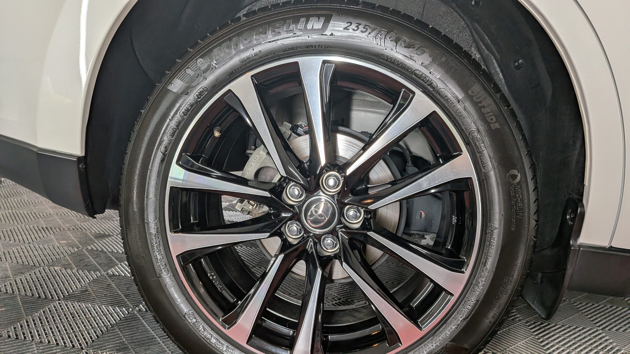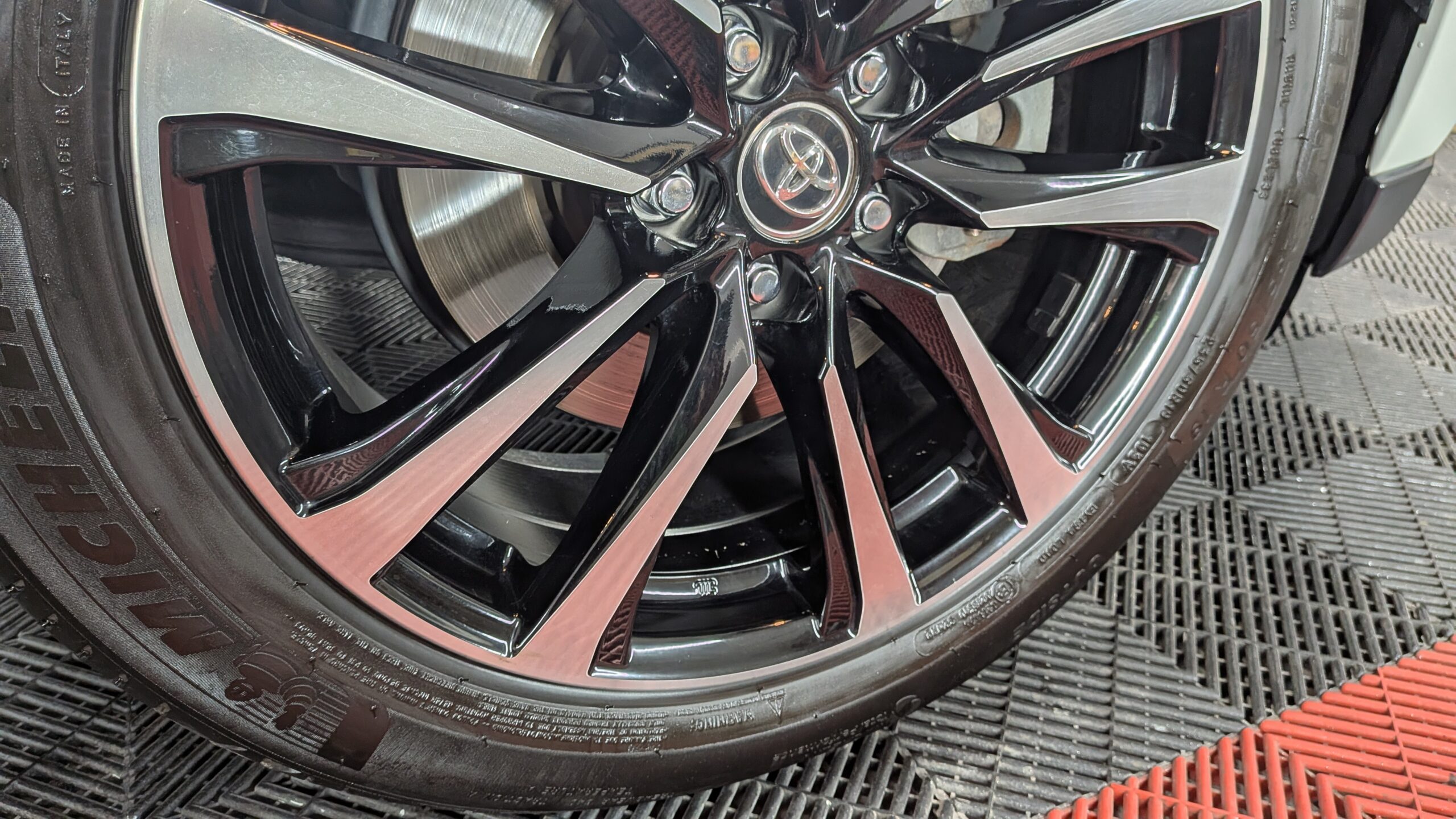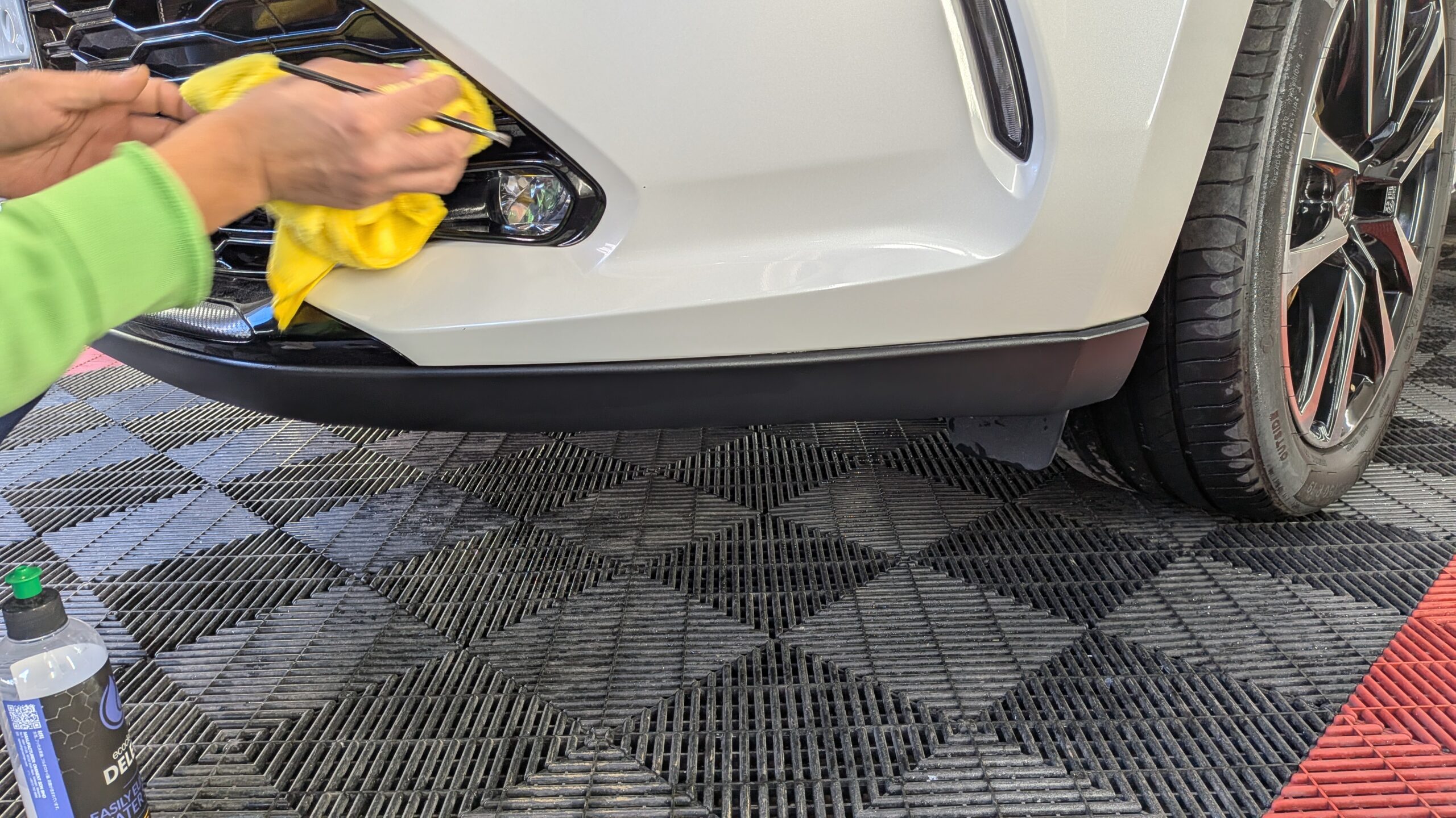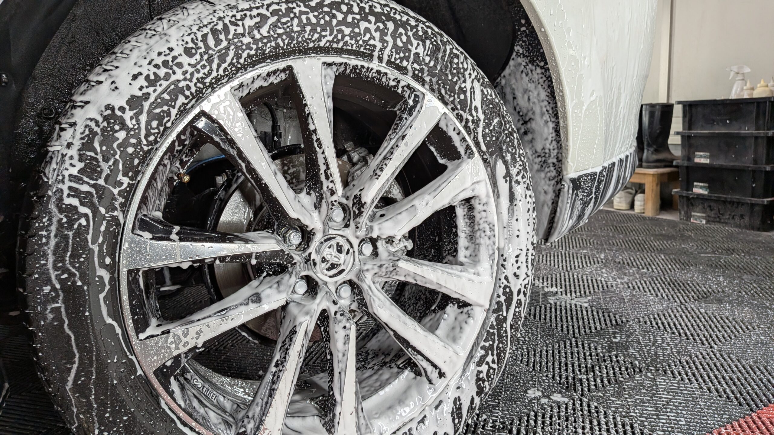 足元の仕上げ終えたところのショット。アルミホイールは洗車までの作業です