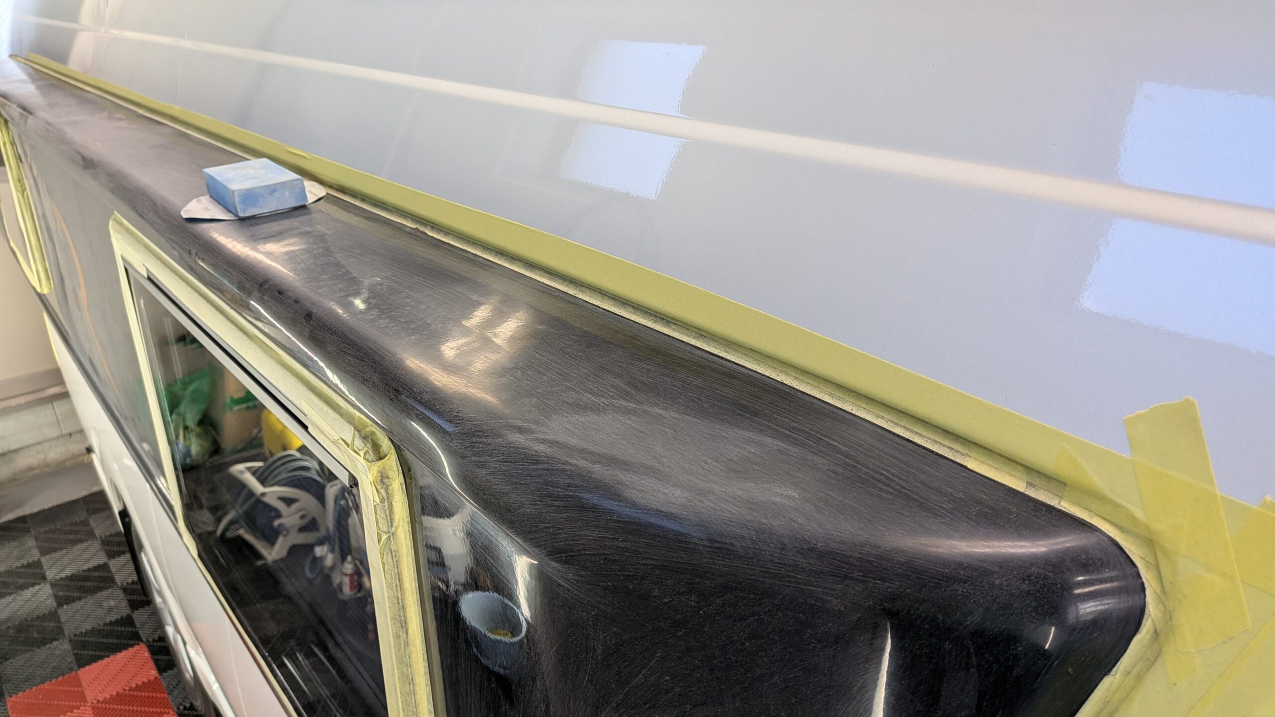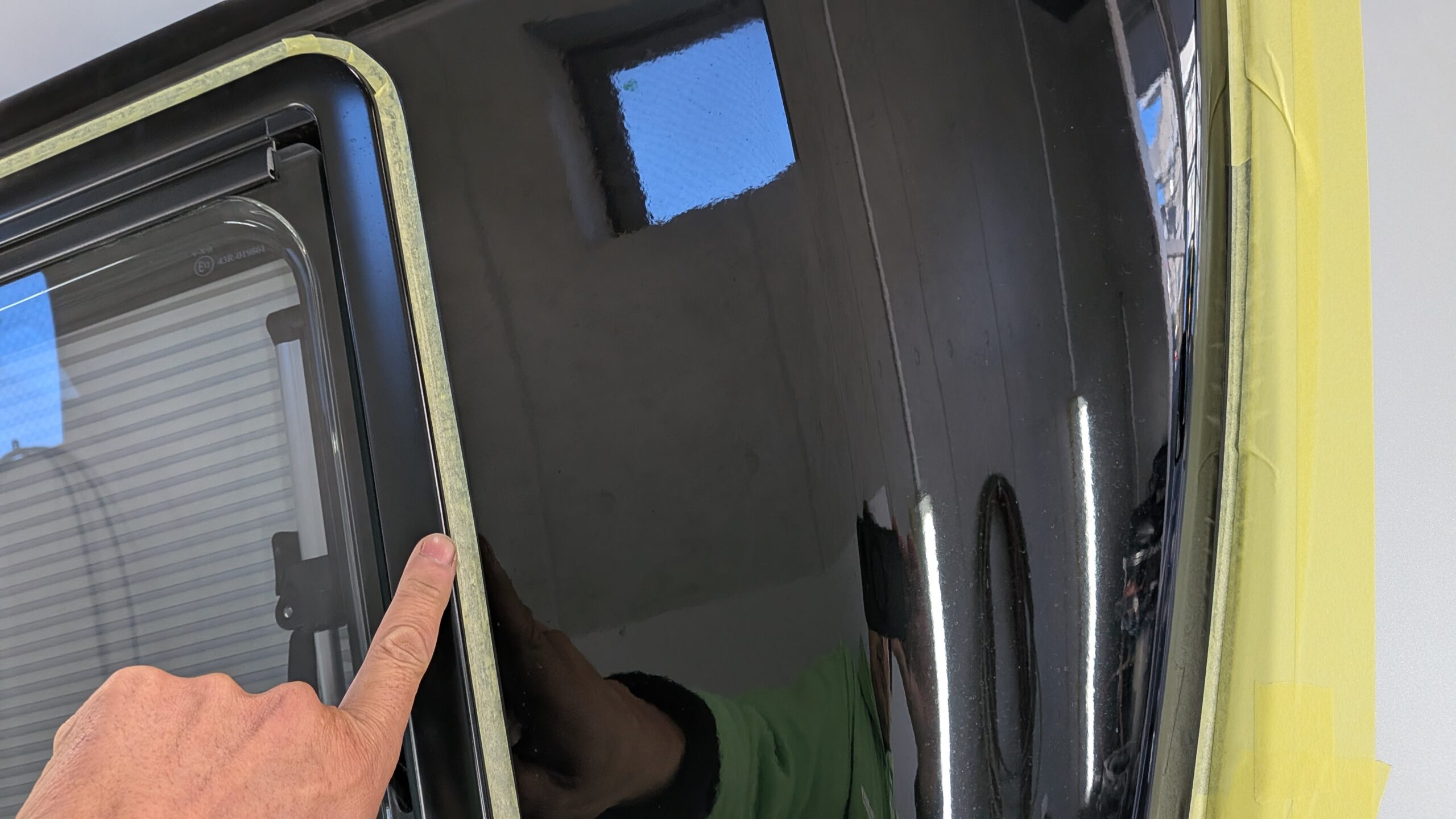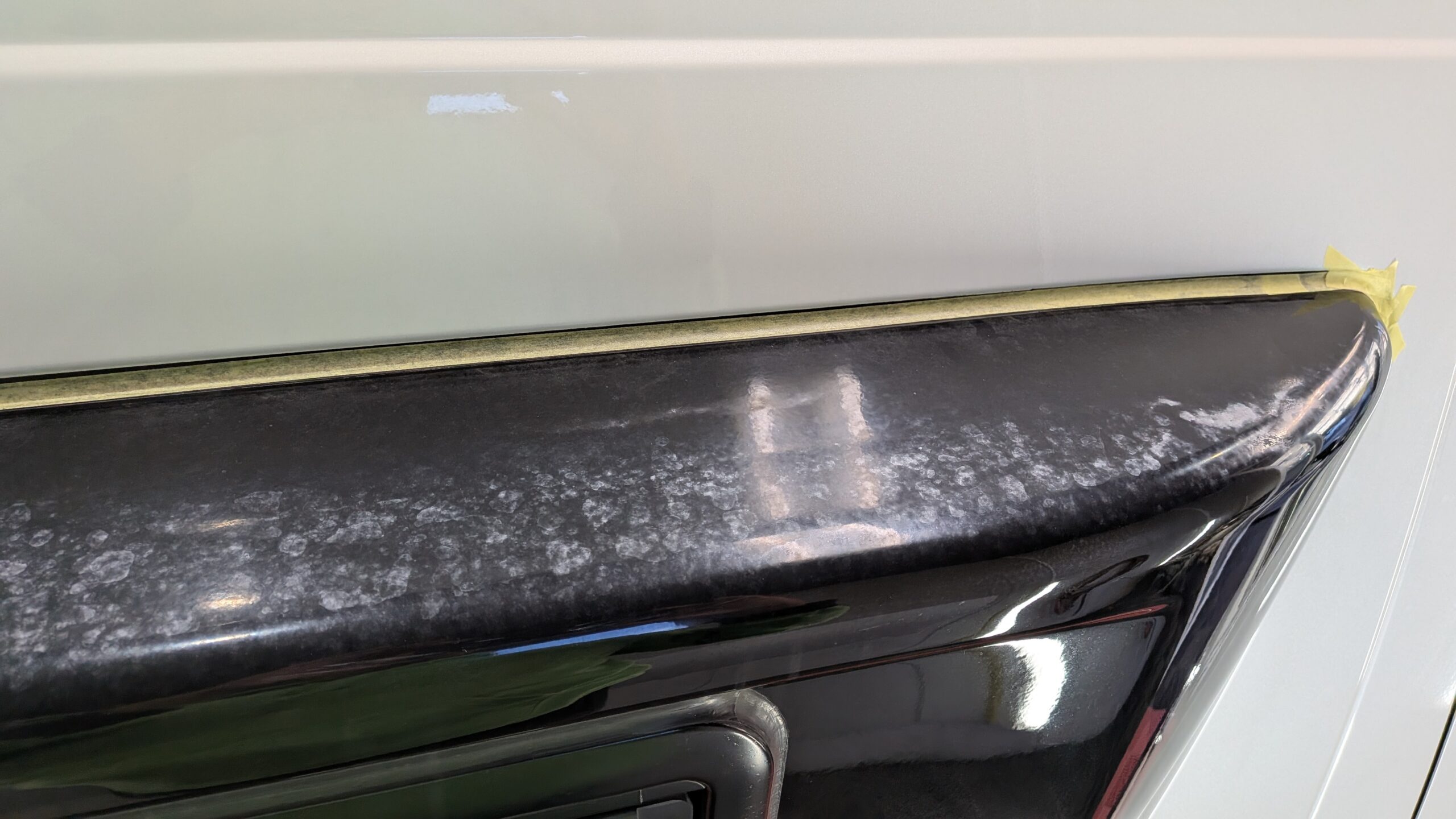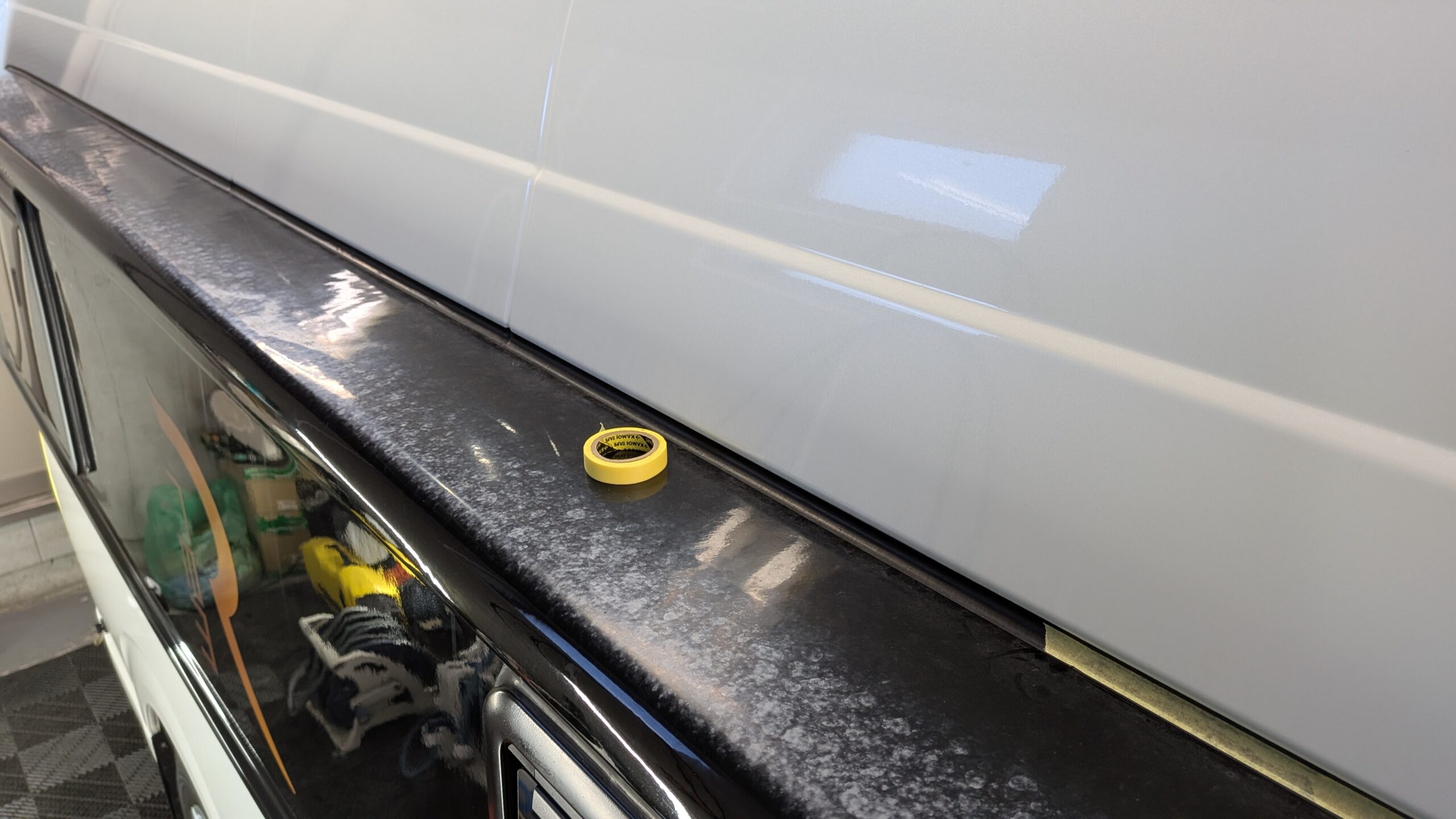 各部ともパーツを外せませんのでマスキング方式で塗装をすることになりますので、写真のシーリング面と今回作業する表面や貼られているカッティングステッカーと今回の塗装面とのキワが多少手作業した感がでます。