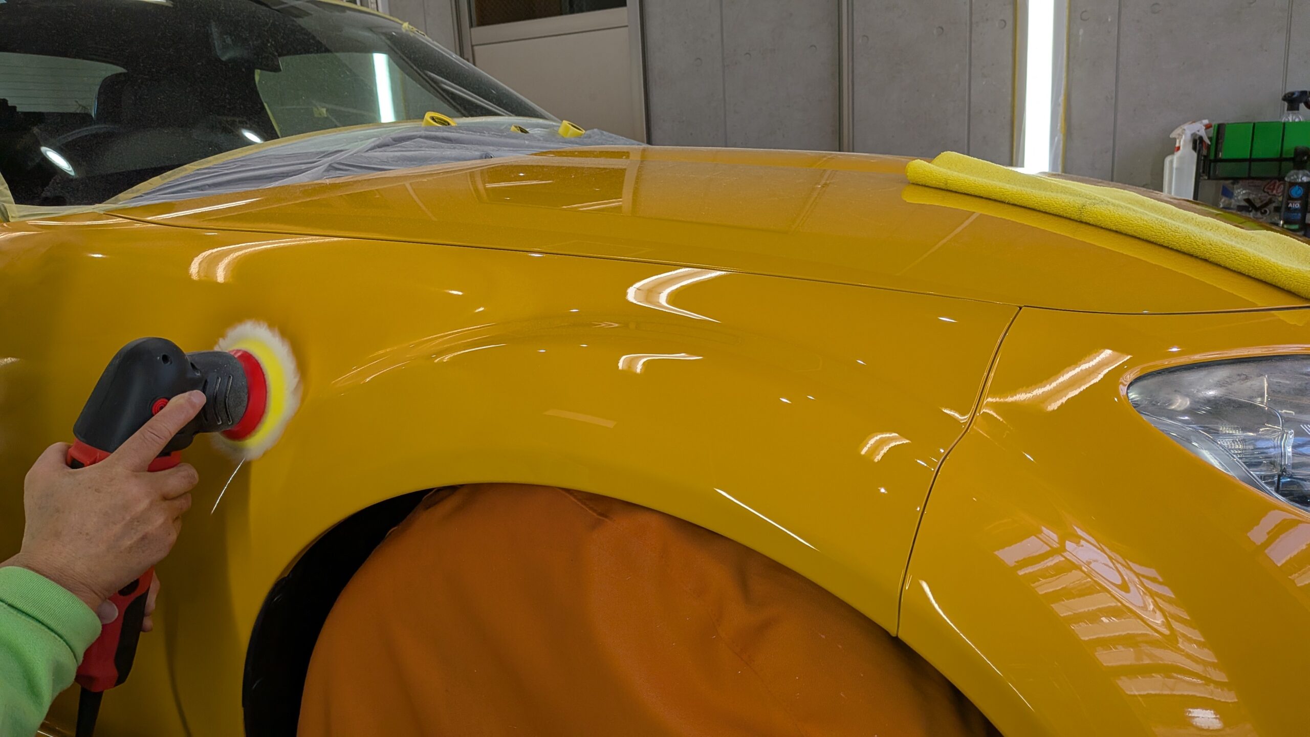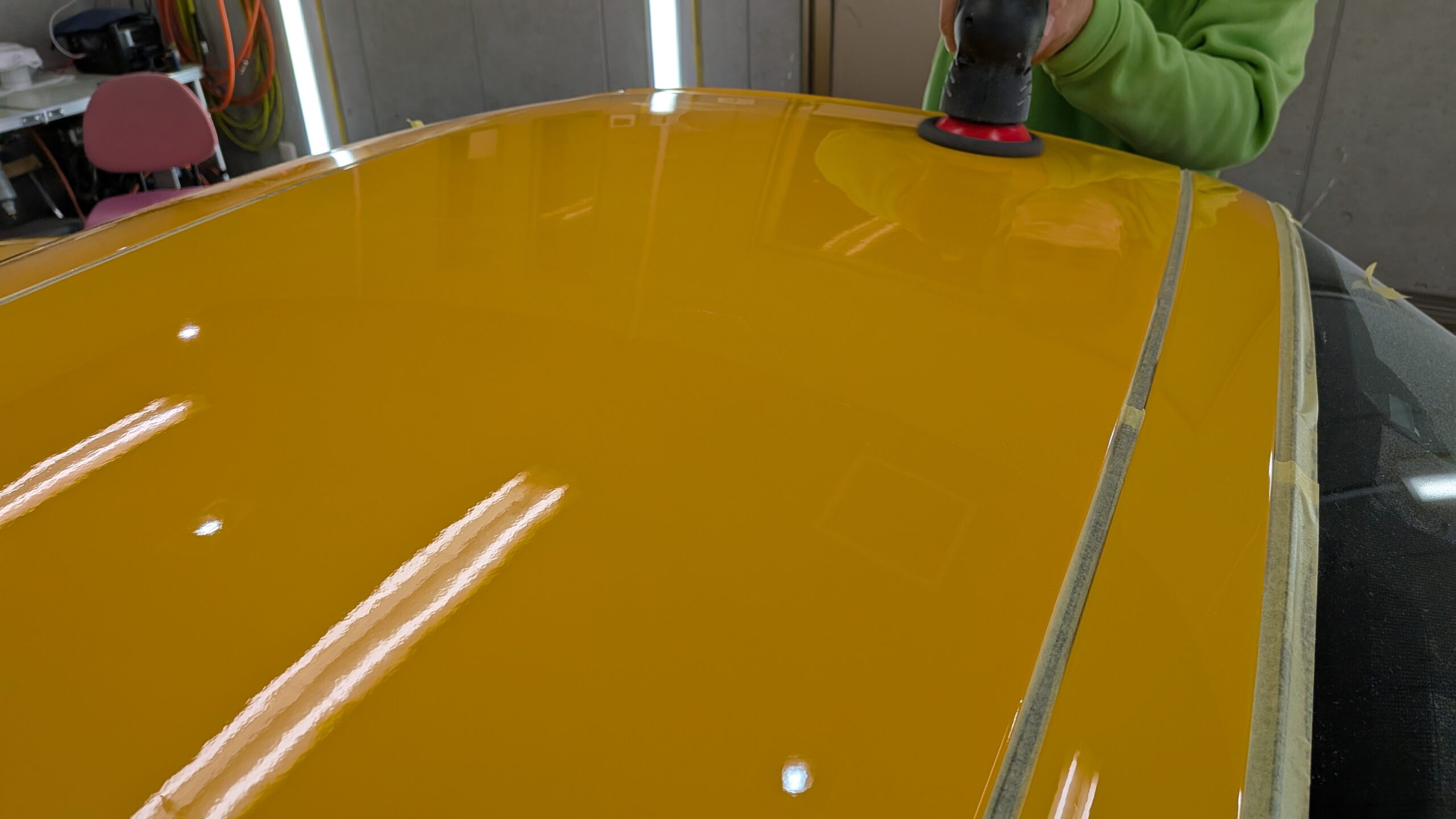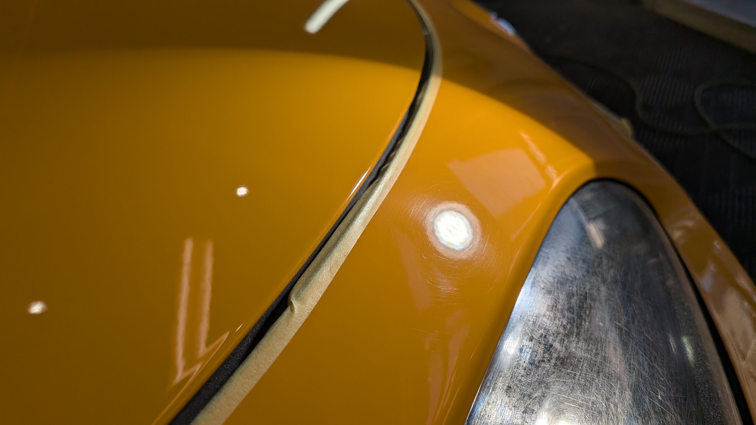 ボンネット中央付近に四角いリペアした後がありますね。これも磨くときは要注意です