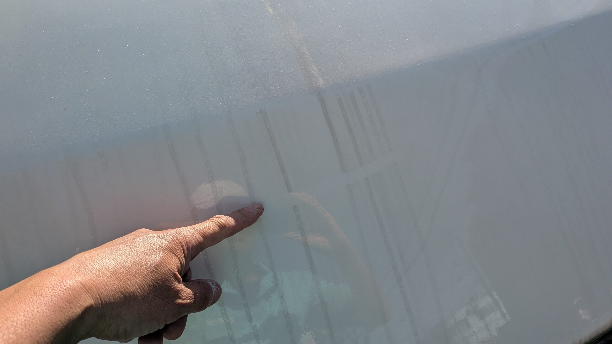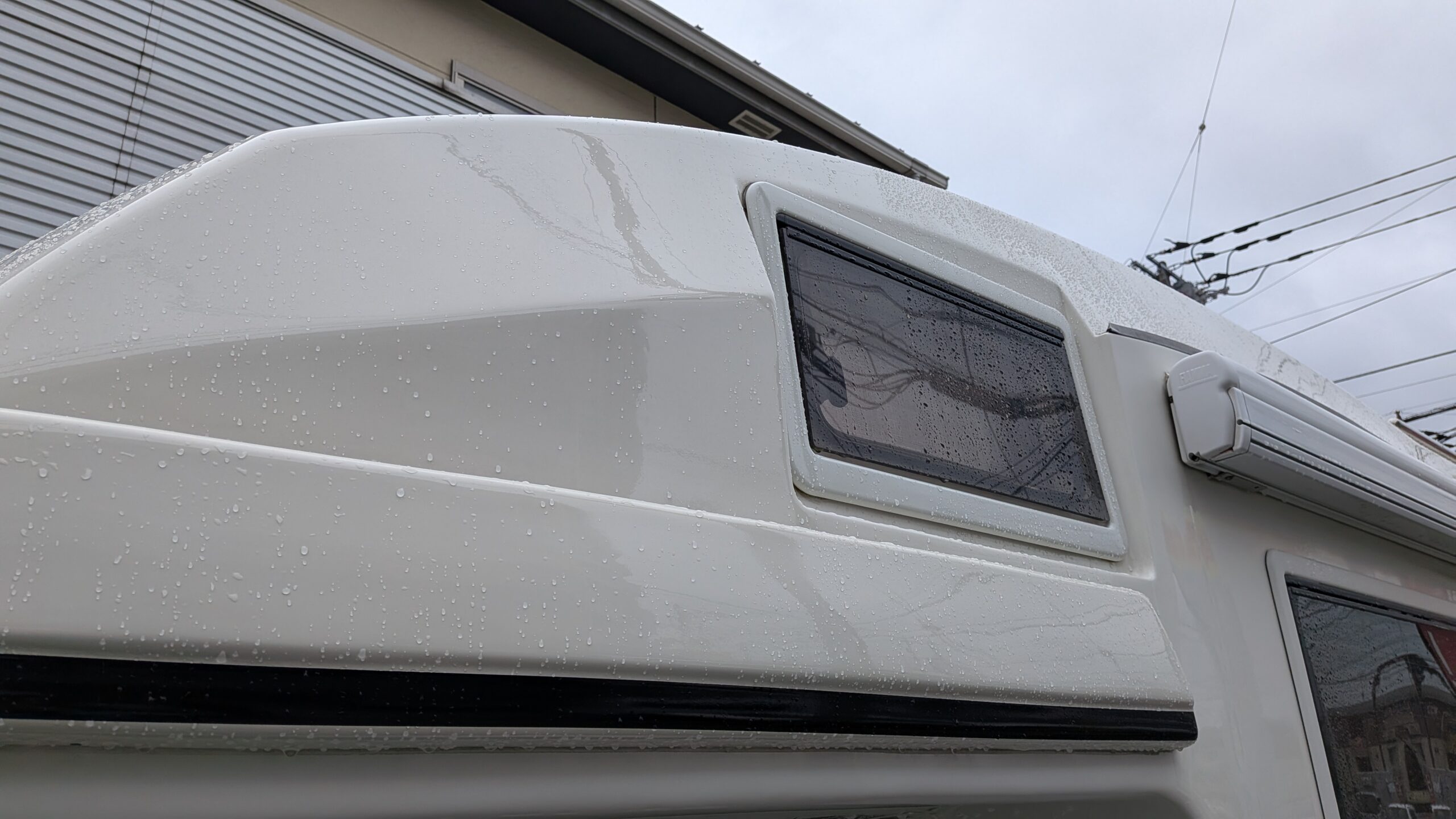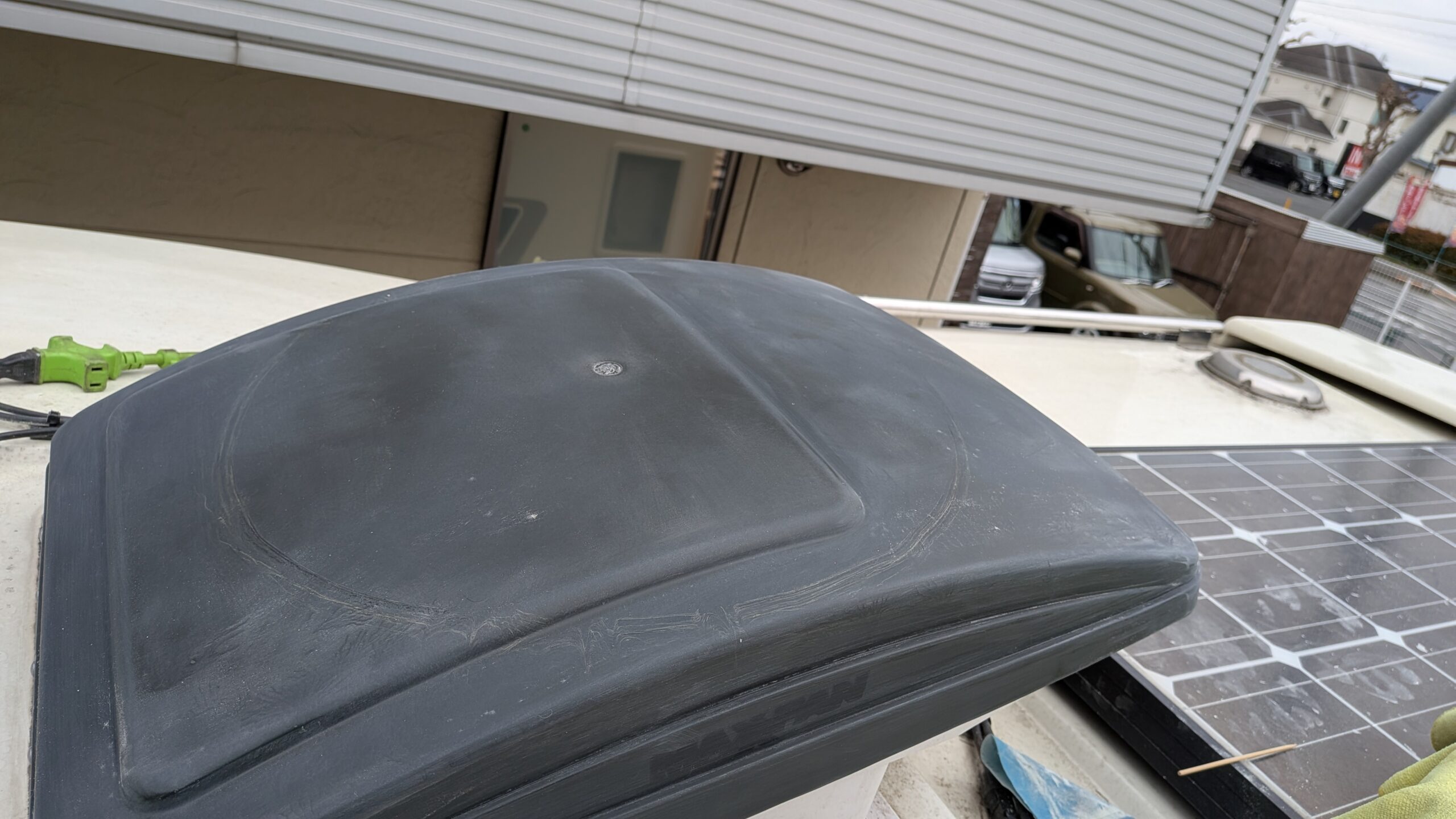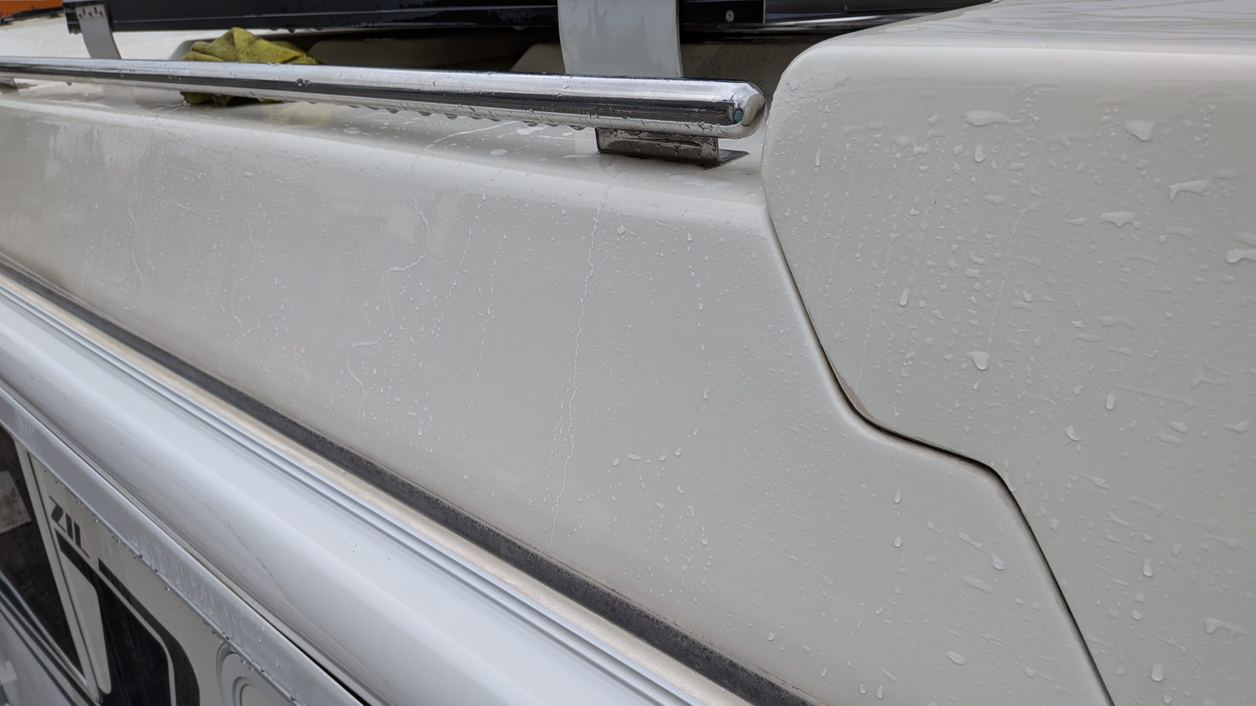 (2026/2/28)東京都よりありがとうございます。1年半前にルーフまわりをクリアー塗装とガラスコーティングさせていただきました。ちゃんとバーコードが落とせて艶が維持できる、、ご体感いただけて良かったです。今回は残りのFRP面を再生をご希望いただきました(__)